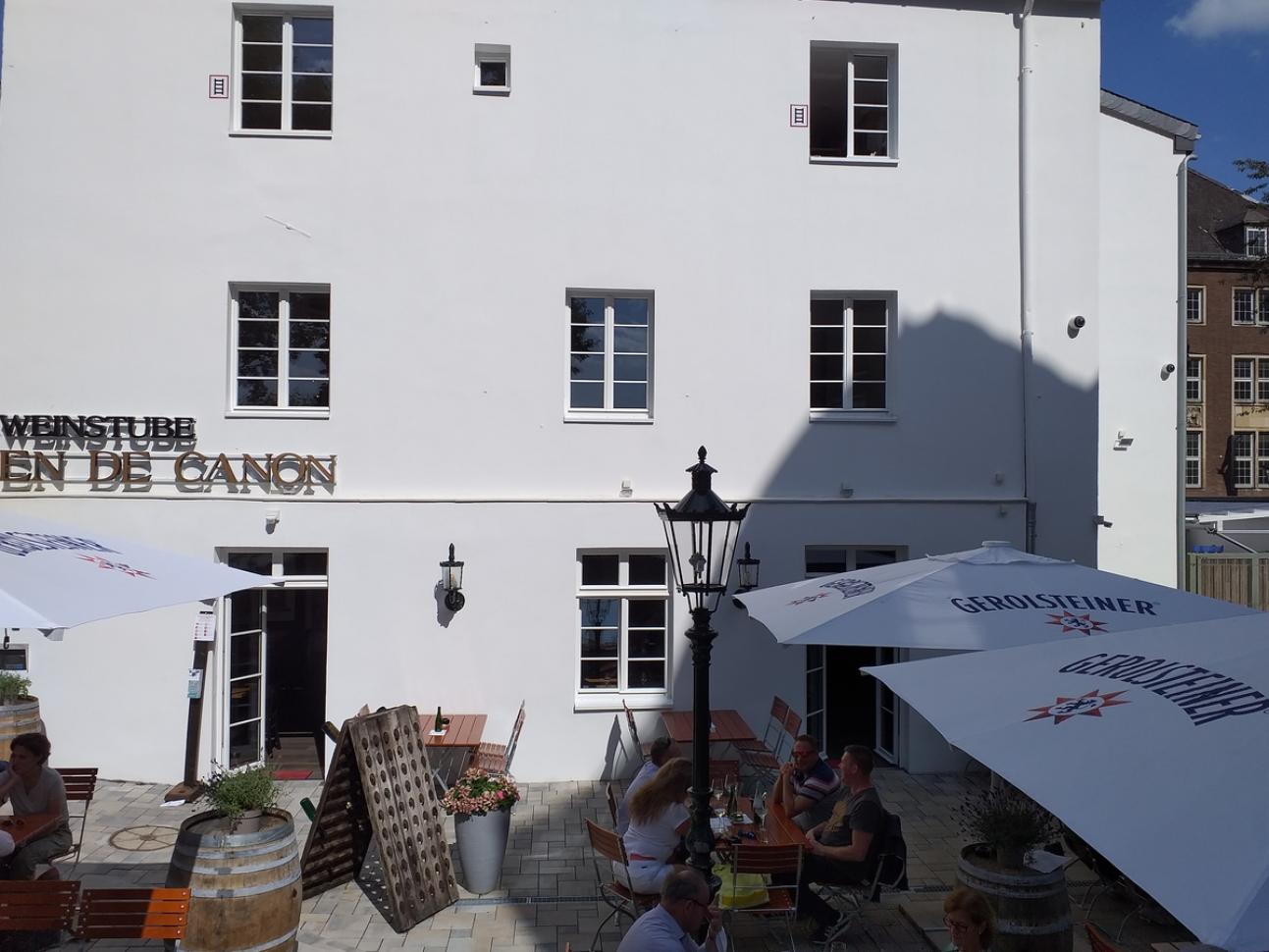 Das unter Denkmalschutz stehende Gebäude wurde im 17. Jahrhundert erbaut. Noch heute ziert das Wappen der einstigen Eigentümer "Maurenbrecher" die Fassade. Auf dem Wappen ist eine Kanone abgebildet, der das Gebäude seinen Namen verdankt. Seit vielen Generationen wird das Haus als Ausschank genutzt und es ist überliefert, dass Napoleon zu Gast war und schon Kurfürst Jan Wellem dort regelmäßig eingekehrt ist. Der neue Pächter hat das in die Jahre gekommene und mit Sanierungsstau stark renovierungsbedürftige Haus umfassend saniert. Dabei waren auch die Fenster ein wichtiges Thema. Die Sünden der letzten 60 Jahre - unter anderem falsch gegliederte Fenster - wurden in enger Abstimmung mit der zuständigen Denkmalschutzbehörde wieder beseitigt und so wurden neue PaXretro78 Holzfenster eingebaut. Da das Gebäude in einer relativ engen Gasse der Düsseldorfer Altstadt liegt, wurde besonderer Wert auf geprüfte Einbruchhemmung und hohen Schallschutz gelegt. Heute wird "En de Canon" in guter Tradition als Weinstube mit besonderer Atmosphäre genutzt und nicht nur die Düsseldorfer wissen um die Qualität der gebotenen Getränke und Speisen.