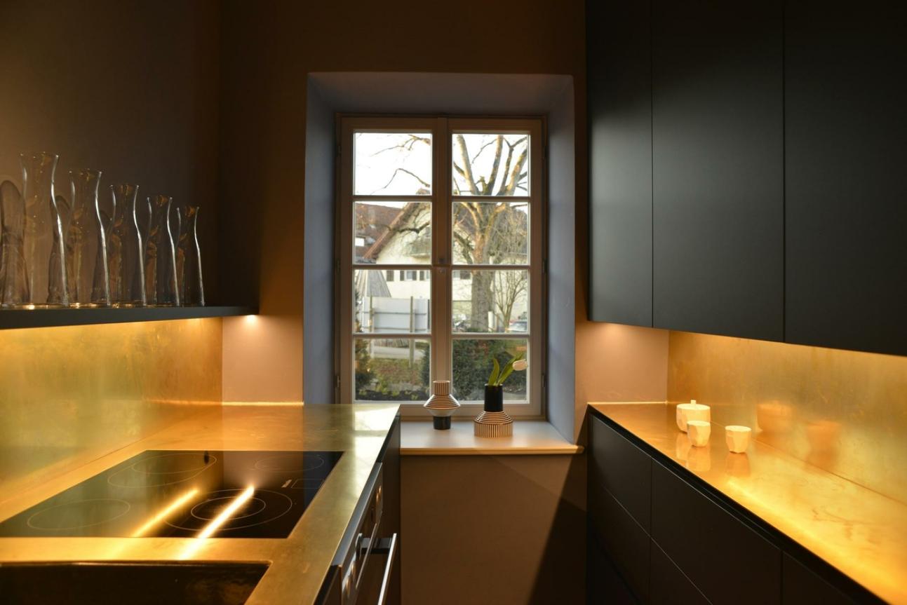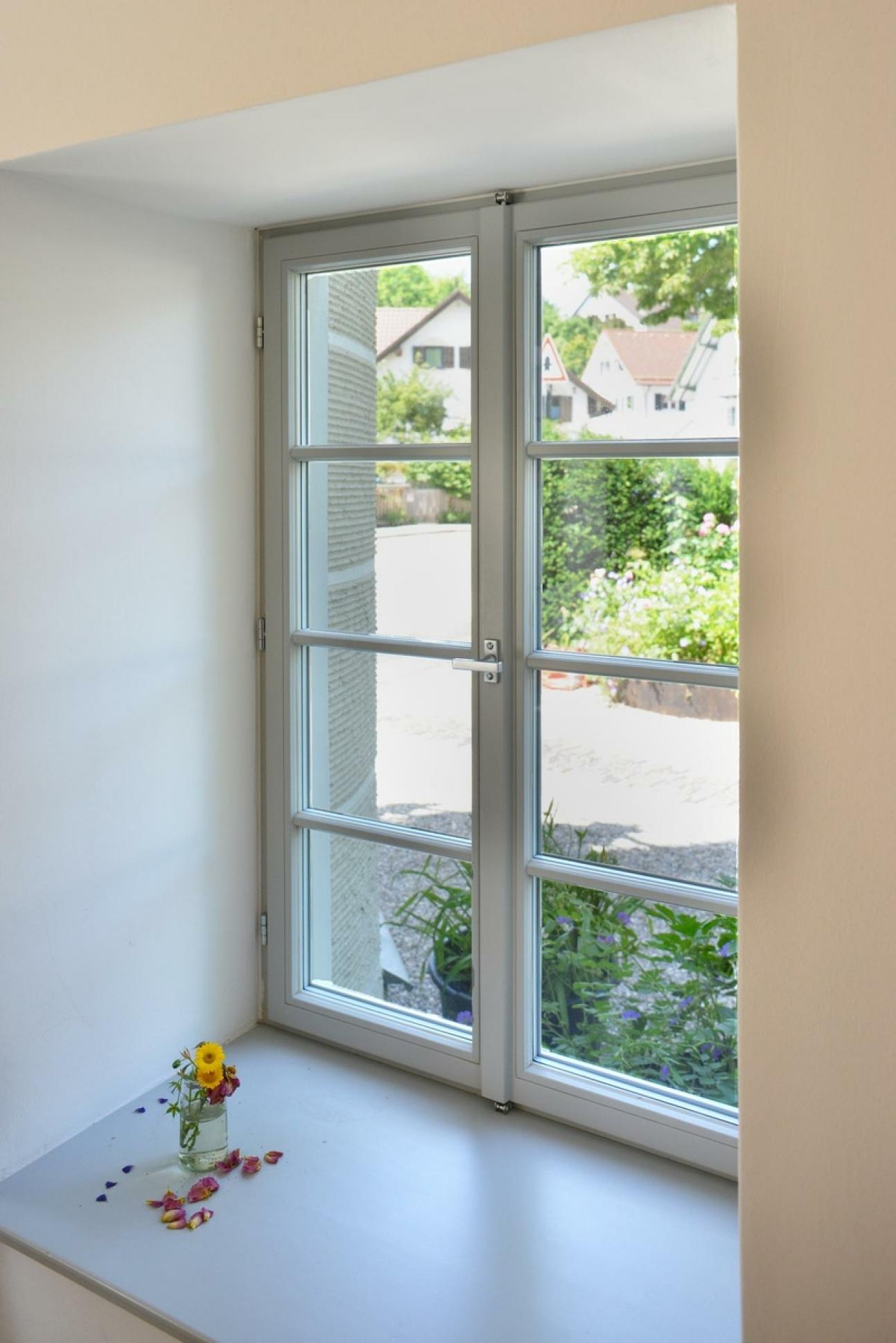 Sprossenfenster vervollständigen das Bild. Trotz schmaler Ansichten mit Stulpbreiten unter 9cm konnte eine energiesparende Dreifachverglasung verbaut werden, vom Betrachter kaum zu erkennen.