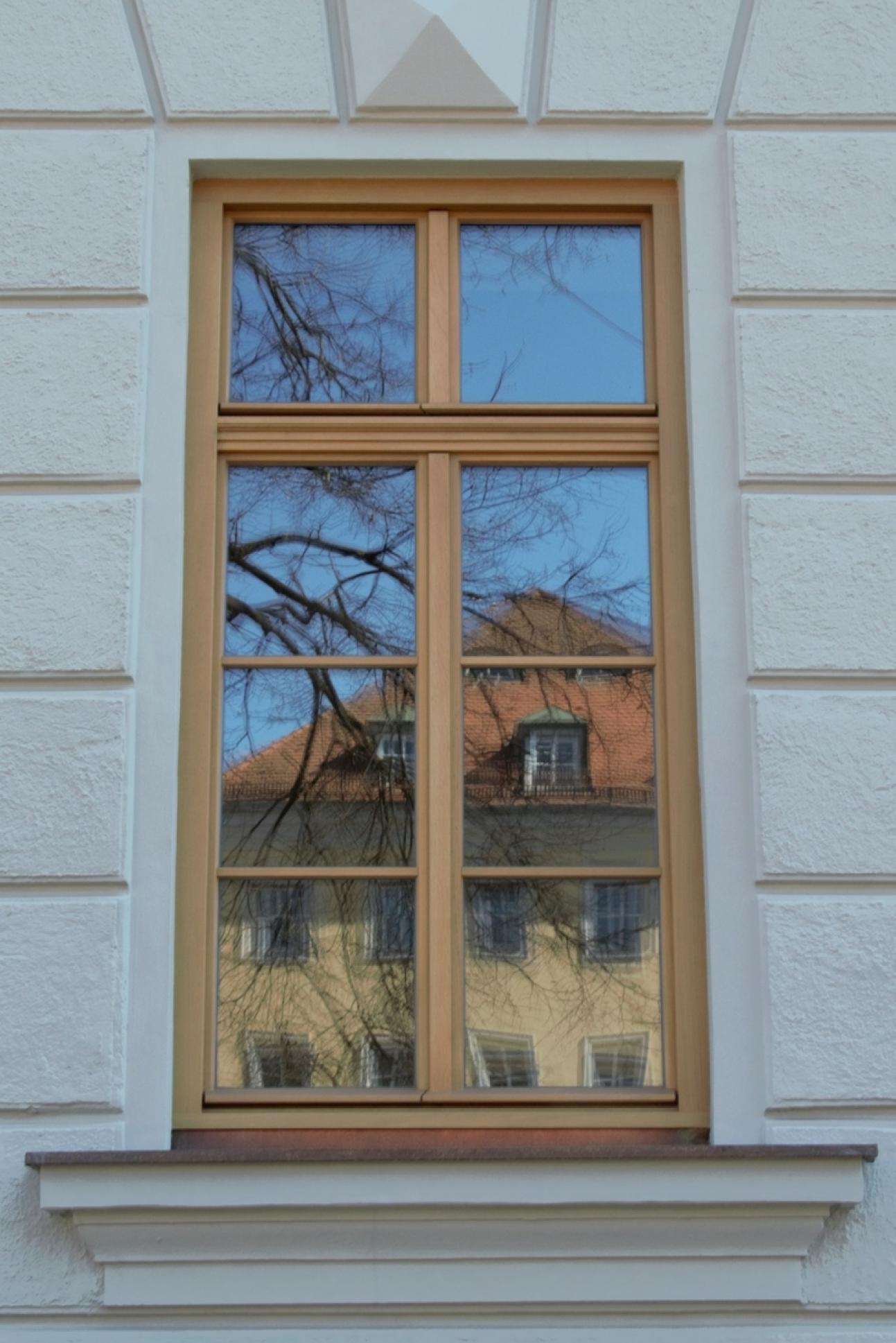 Lasierte holzsichtige Eichenfenster schmücken jetzt die Fassade. Eine Besonderheit ist dabei der für Augsburg typische und aus einem Stück gerfertigte tiefe Blendrahmen. Auf die „Industriefuge”am Übergang waagrechter auf senkrechter Hölzer, im Fensterbau erst seit den 1970er Jahren üblich, wurde bewusst verzichtet.