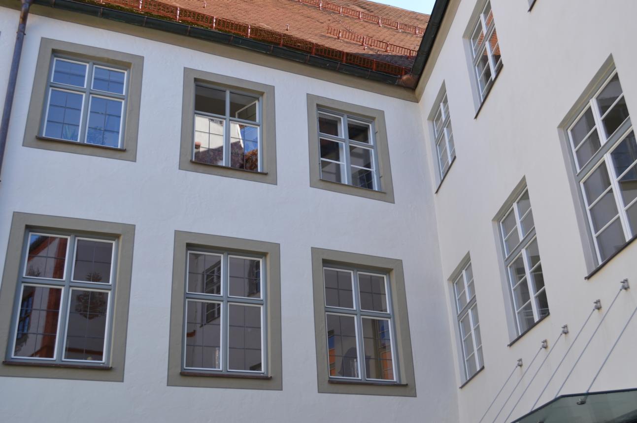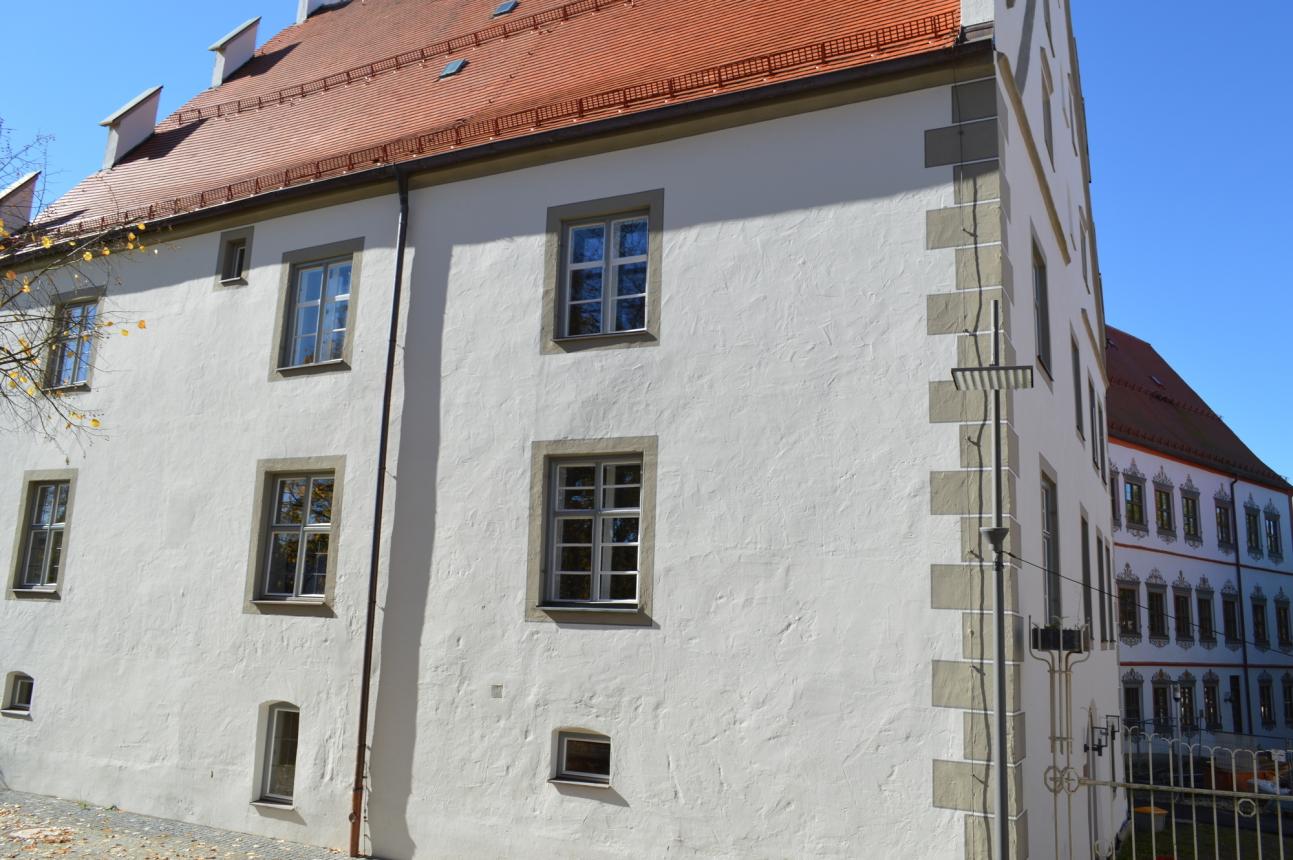 Knapp 200 Jahre später, um 1730 wurde das Schloss „barockisiert“, wie die Änderungen an der Fassade noch heute anschaulich zeigen. Das alte Schloss und das neue Schloss wurden zu dieser Zeit mit einem dreigeschossigen Satteldachbau verbunden. Die Anlage, seit vielen Jahrzehnten im Besitz der Stadt war in die Jahre gekommen und stark sanierungsbedürftig. Ein renommiertes Architekturbüro nahm den Auftrag an und sanierte die miteinander verbundenen Gebäude fast 2,5 Jahre unter den kritischen Augen der Denkmalpflege umfangreich. Dabei waren auch die Fenster ein Thema. Hier wurde - um die unterschiedlichen Gebäude wieder erkennbar zu gestalten – verschieden Teilungen, Zierprofile und Farben verwendet. Die Besonderheit liegt in den für diese Zeit typischen Karniesbleisprossen, die auch noch bei wenigen historischen Fenstern als Vorlage dienten. Und wenn schon Karniesblei und der Wille, möglichst denkmalgerecht zu reproduzieren, dann ist auch technisch perfektes, modernes Floatglas fehl am Platze. Insofern wurde hier – neben den für die Region typischen tiefen Fensterrahmen – auch ein adäquates Restaurierungsglas mit „lebendiger, unruhiger“ Glasoberfläche verwendet. Auch die für Teile Süddeutschlands markante, aufwendig gemalte Lüftlmalerei (Illusionsmalerei) trägt zum beeindruckenden Sanierungsergebnis bei.