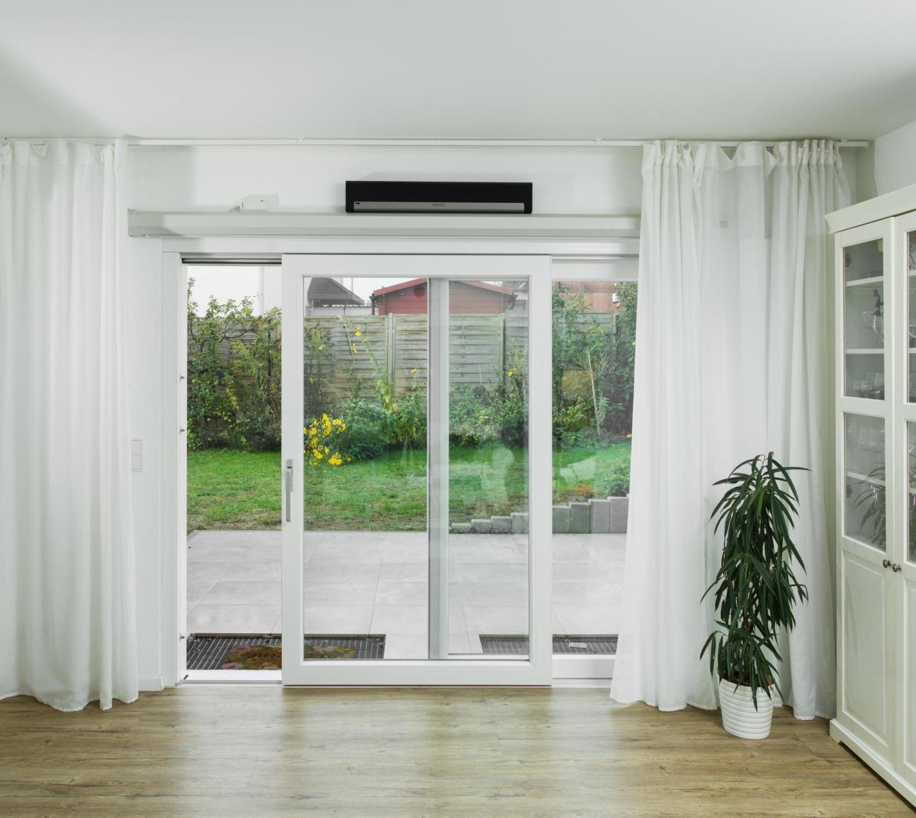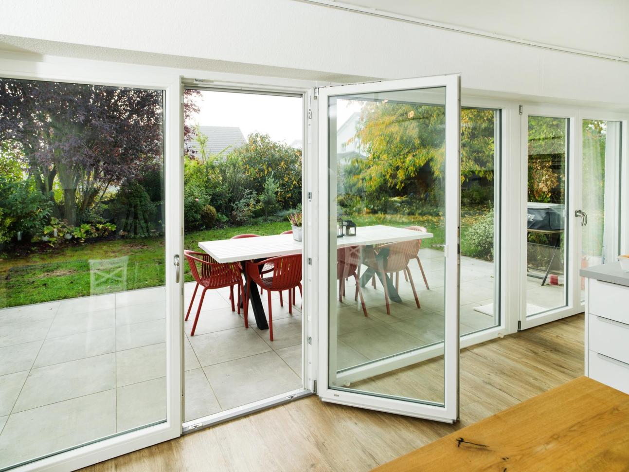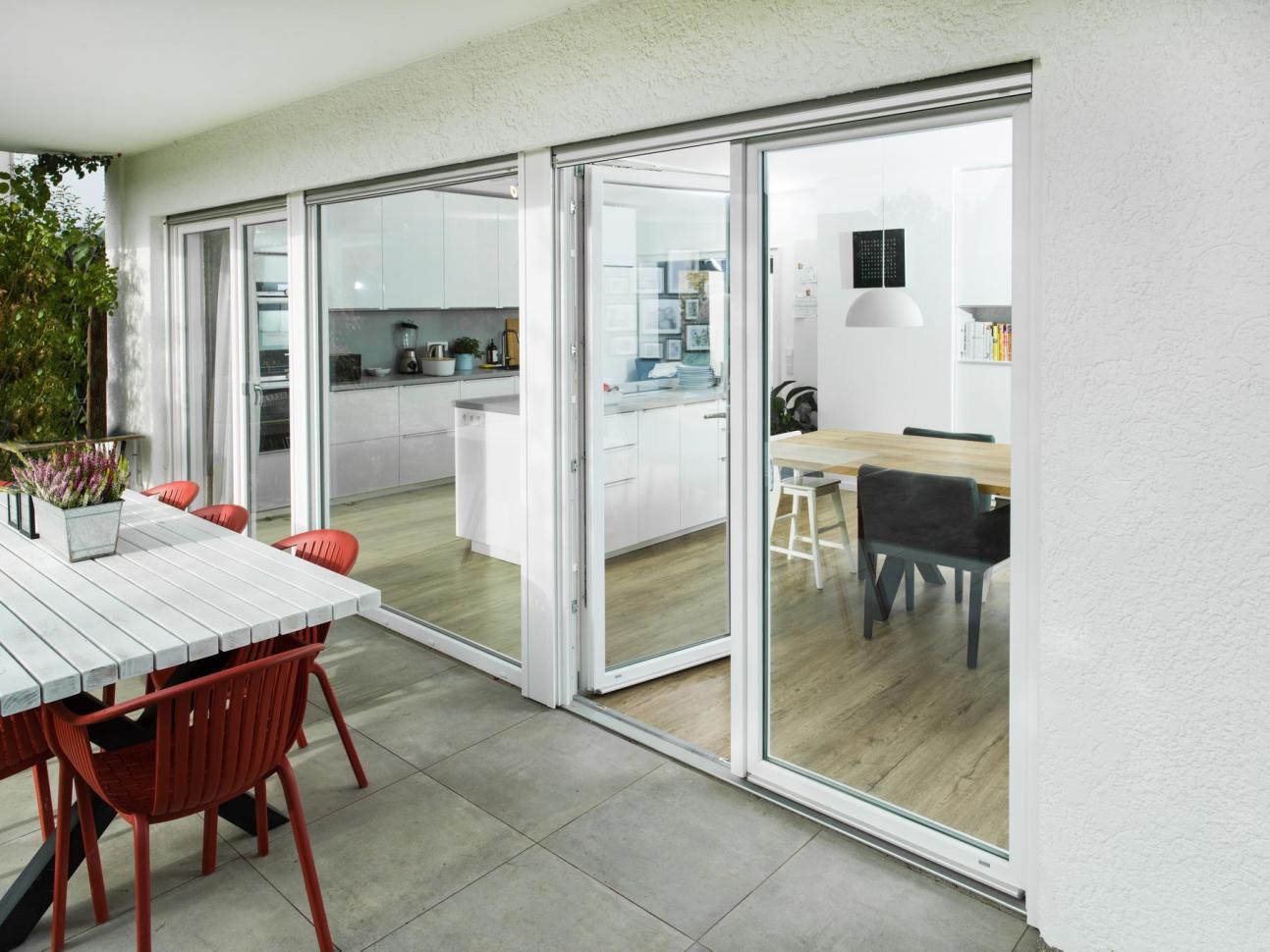 Zum Einsatz kam das moderne Kunststofffensterprofil PaXabsolut Neo, das mit sehr guter Wärmedämmung und hohem Einbruchschutz überzeugt. Im angrenzenden Wohnzimmer sorgt eine leichtgängige Hebeschiebetür aus weißem Kunststoff für zusätzlichen Komfort und einen einfachen Zugang zur Terrasse.