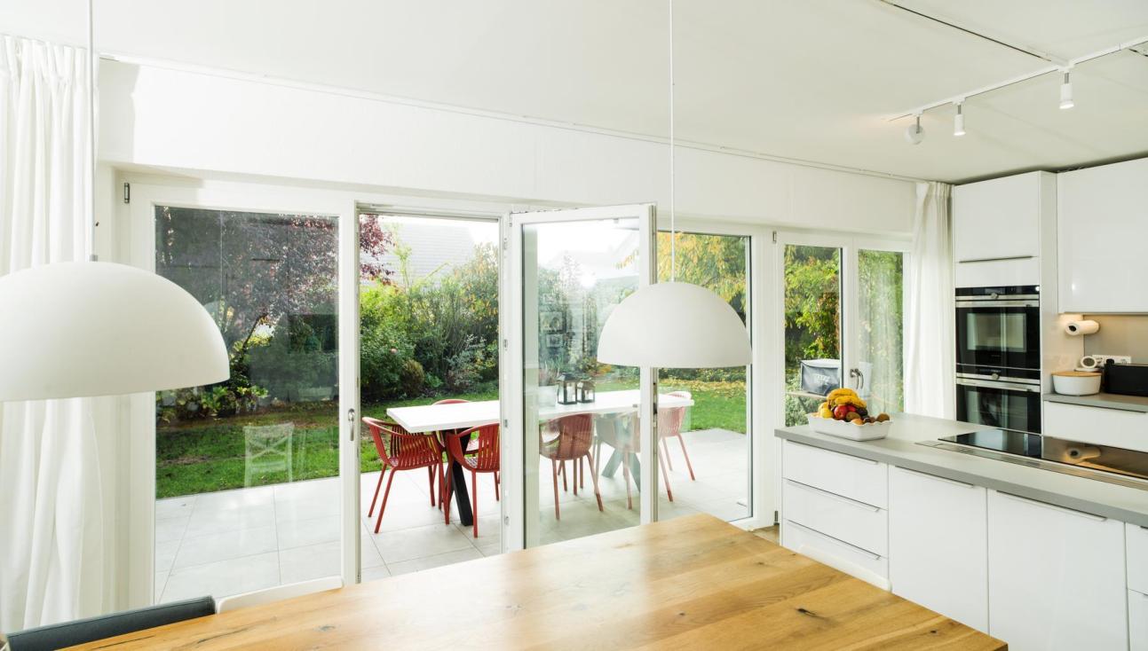 Bei der Sanierung ihres Wohnhauses in Geisenheim legten die Eigentümer besonderen Wert auf lichtdurchflutete Räume und eine spürbare energetische Verbesserung. In der Wohnküche ersetzte eine großzügige, bodentiefe Terrassentüranlage die bisherige Kombination aus Balkontür und Festverglasung aus den 1980er Jahren – ein echter Gewinn an Helligkeit und Lebensqualität.