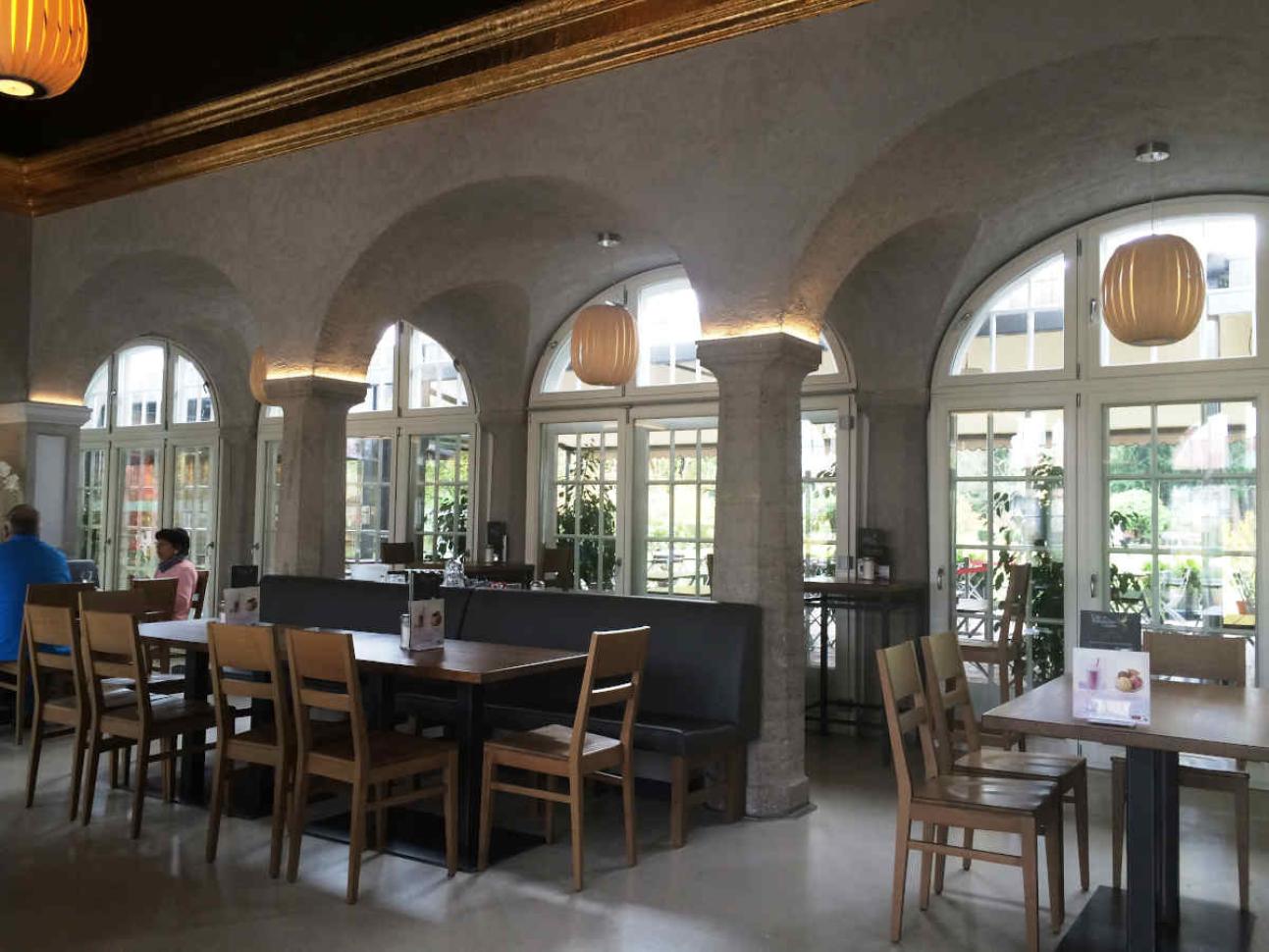 Besonders einladend ist auch das Café im denkmalgeschützten Cafe-Pavillon des Gartens. Besucher genießen neben diversen Köstlichkeiten von dort den Blick auf den Rosengarten und den barockisierenden Monumentalbau des Hauptgebäudes.