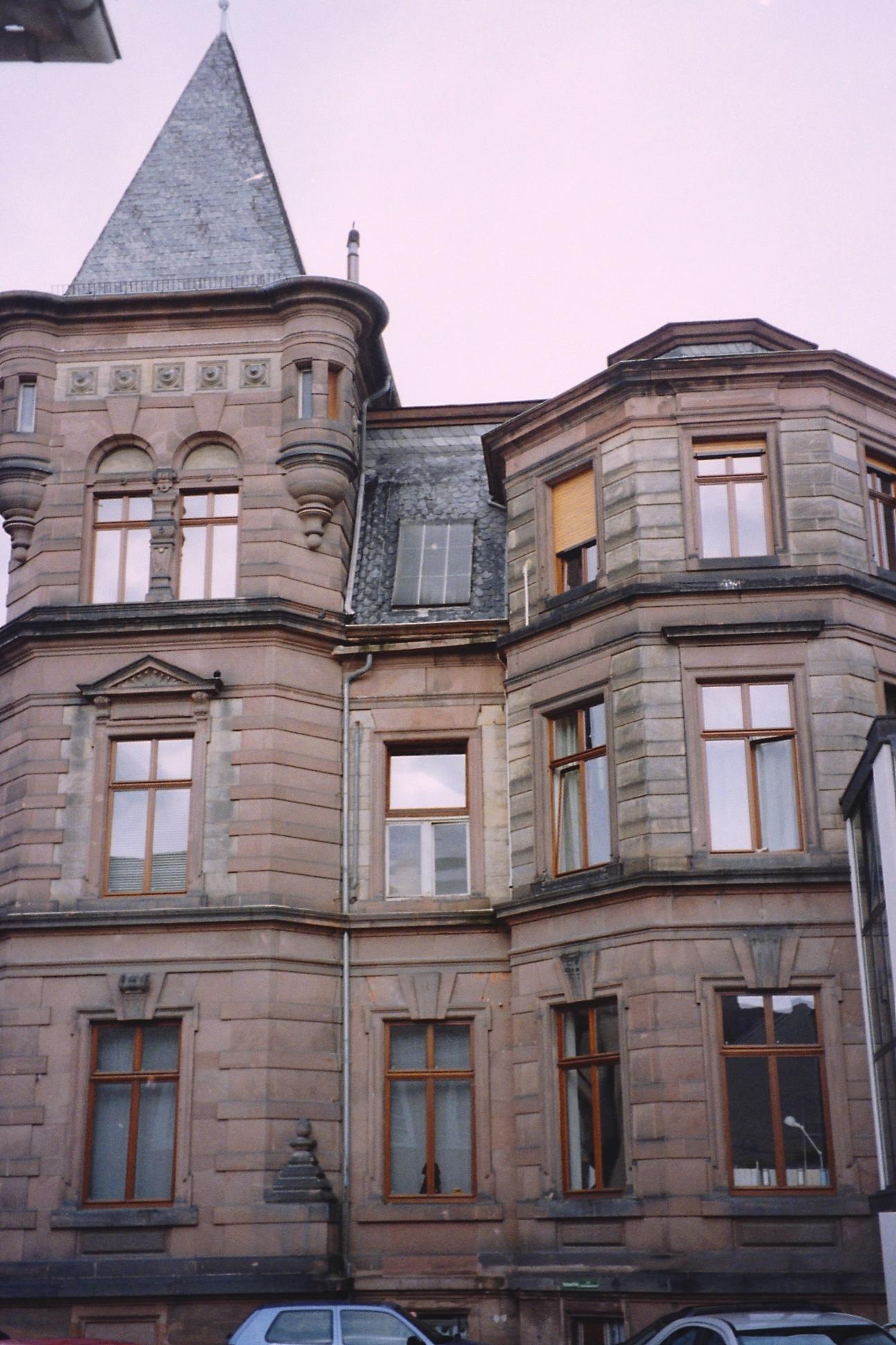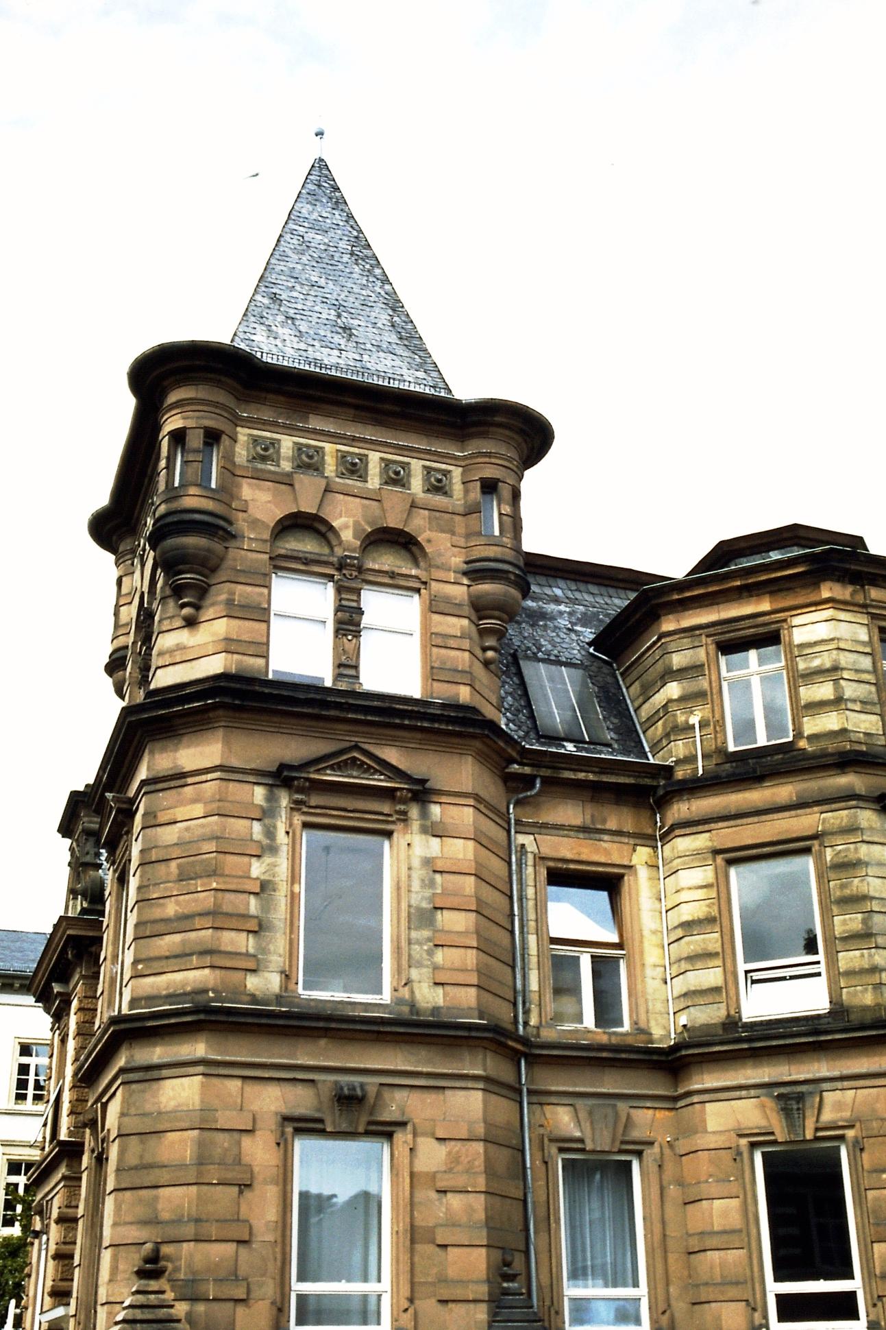 Gegründet 1885, Einzeldenkmal. Repräsentativer gründerzeitlicher Sandsteinquaderbau mit ehemaligem Wasserturm mit Eckerkern, gegen 1885, Architekt Wilhelm Manchot aus Mannheim.