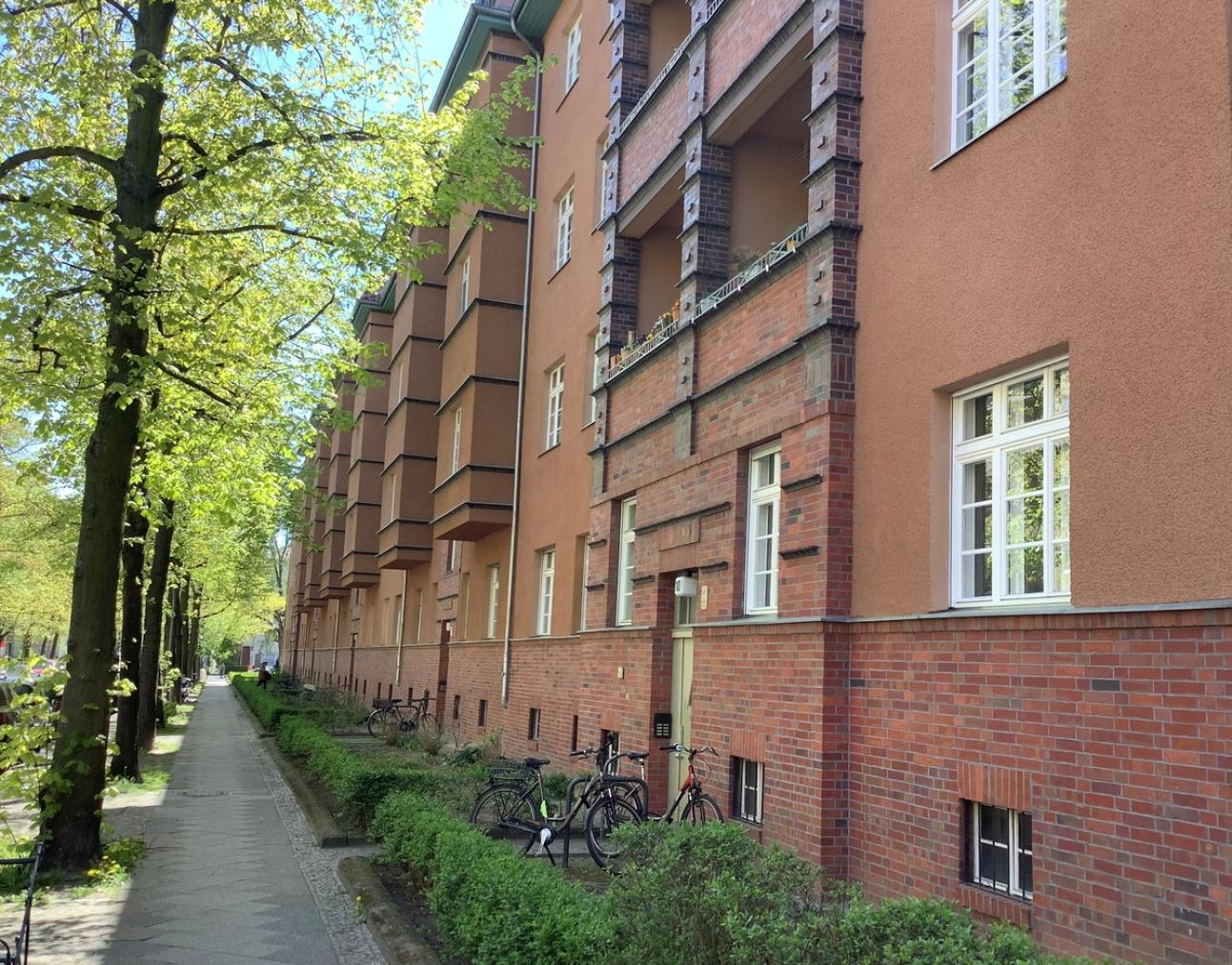 Die Wohnanlage, bestehend aus mehreren Gebäuden in Berlin Wilmersdorf, wurde 1927/28 nach Entwürfen des Architekten Georg Pötschke für die Charlottenburger Baugenossenschaft errichtet und steht als Ensemble unter Denkmalschutz. Pötschke ist es sehr gut gelungen, die viergeschossigen Gebäude nicht langweilig wirken zu lassen. Ein ca. 150cm hoher, durchlaufender Sockel aus roten Backsteinen wird ab dem Erdgeschoß von ruhigen, verputzen Flächen abgelöst. Hervorkragende, Risalit-artige Erker mit feinen Gesimsen sowie zurückspringende Balkone, eingerahmt von sparsam geschmückten Backsteinen, verleihen den Gebäuden eine schöne Plastitizität und nehmen die Wucht aus den lang gezogenen Zeilen. Die neuen Kastenfenster sind in der äußeren Ebene mit 4mm Floatglas und 45mm Bauteiltiefen Profilen hergestellt; die inneren Flügel sind mit 58mm Bauteiltiefe und einer Isolierverglasung konstruiert. Die schlichten Zierprofile wurden in enger Abstimmung mit der zuständigen Denkmalbehörde und in Anlehnung an historische Fenster ausgesucht. Das Gesamtsanierungsergebnis ist als ebenso nachhaltig wie gelungen zu betrachten.