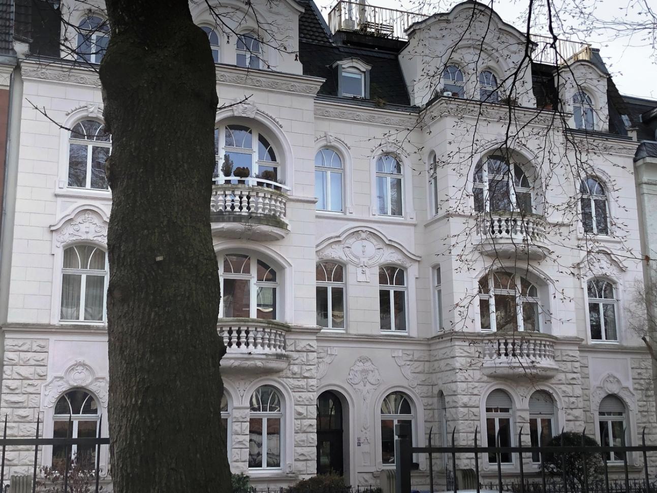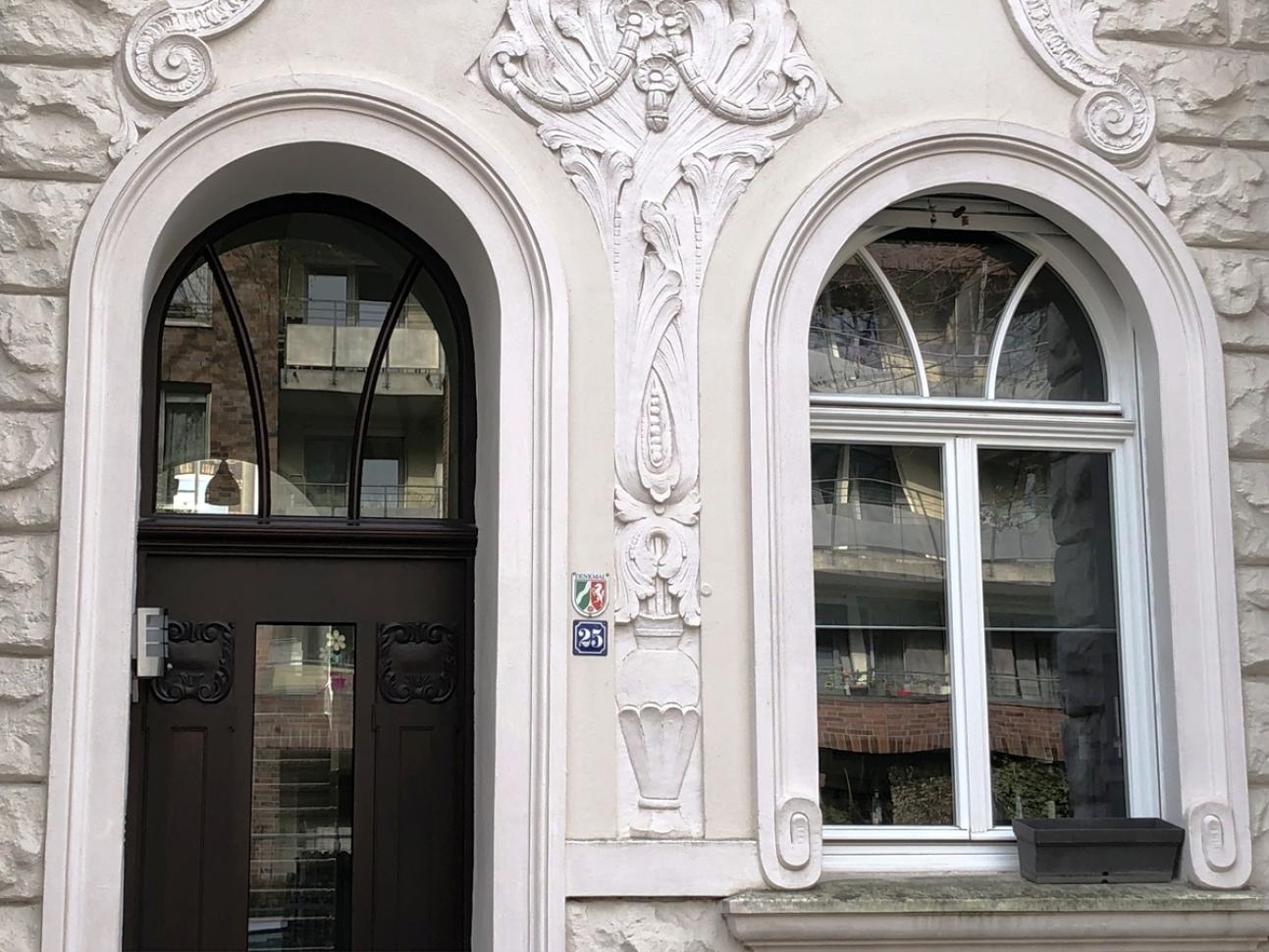 Das bereits 1983 unter Denkmalschutz gestellt Mehrfamilienhaus beeindruckt durch die Vielzahl an für die Gründerzeit (dem Historismus) typischen Schmuckformen. Das Erdgeschoß mit seiner starken Rustifizierung (grob geschlagen Quaderung), den Medaillons mit Volutenkrönung (rund oder oval geformte Schmuckfelder mit Relief), die Maskaronen (Fratzenköpfe) und die Rocaillemotive in den Gesimsfriesen sind nur einige der gestalterischen Kunstgriffe, die der Architekt hier vollzogen hat. Auch die Fenster mit Stich- und Rundbögen, Zierprofilen und vor allem den beiden strahlenförmigen Sprossen in den Oberlichtern verleihen der Fassade eine besondere Bedeutung. Die neuen Fenster wurden in enger Abstimmung mit dem zuständigen Stadtkonservator rekonstruiert. Als Vorlage der Zierprofile (Kämpfer) diente die historische, überarbeitete Haustür sowie historische Bildaufnahmen.