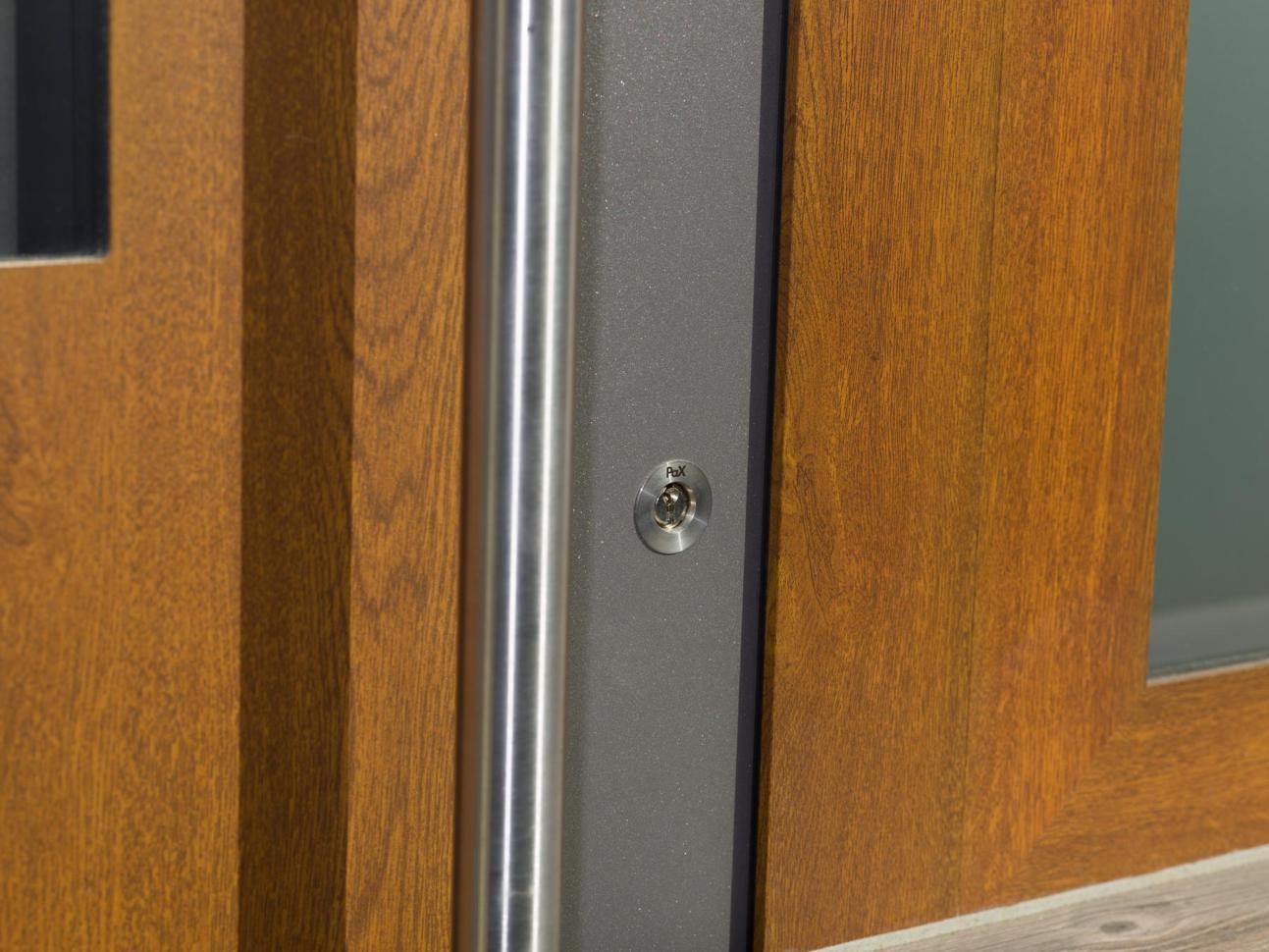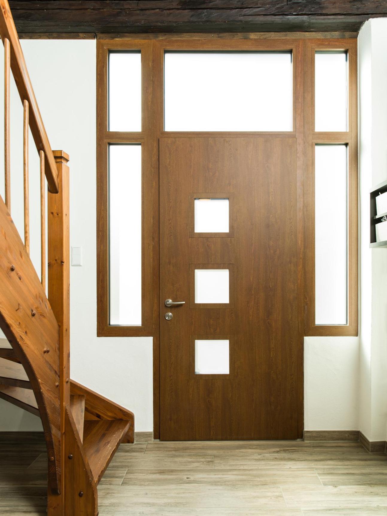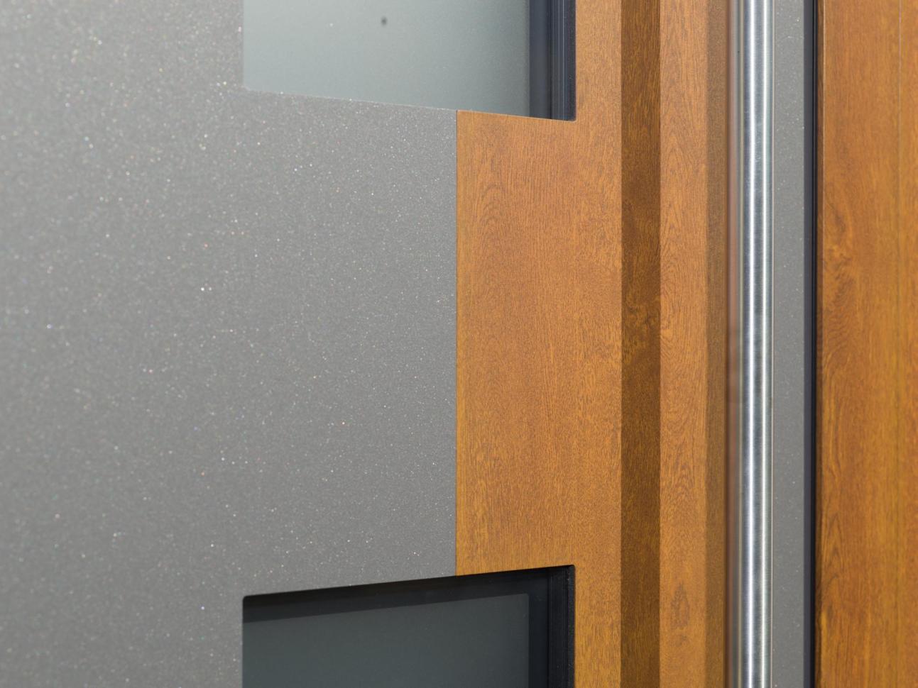 Für ein charmantes Reihenhaus in Fachwerkbauweise in Ingelheim lieferte PaX eine elegante PaXentrée Aluminium-Haustür mit Seitenteilen und Oberlicht. Die eingesetzte satinierte Verglasung sorgt für viel Tageslicht, ohne auf Privatsphäre zu verzichten. Die Haustür besticht durch eine hochwetterfeste Holzdekor-Oberfläche im Farbton Golden Oak, kombiniert mit Grau-Aluminium Metallic, ebenfalls in hochwetterfester Ausführung. Ein abgerundeter Stangengriff unterstreicht das hochwertige Design. Seitenteile und Oberlichtrahmen greifen das Golden-Oak-Dekor harmonisch auf. Dreifachverglasung gewährleistet eine hervorragende Wärmedämmung, während die Fünffachverriegelung für zuverlässige Basissicherheit sorgt.
