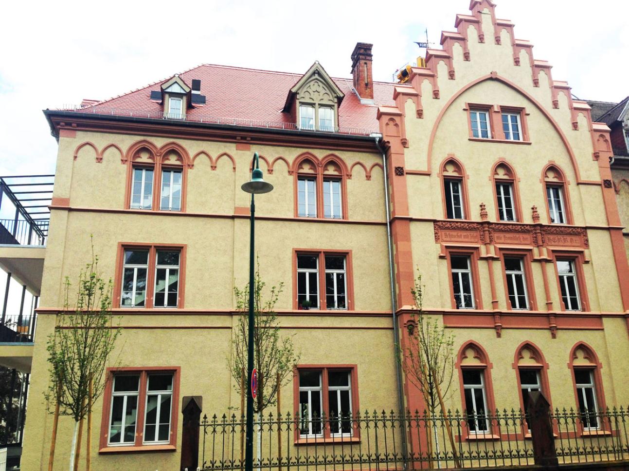 Das langgestreckte, massive Feierabendhaus wurde im Jahre 1898 im Stil neogotischer Architektur gebaut. Es diente als Schwesternhaus des Elisabethenstiftes in Darmstadt. In den Jahren 2014 bis 2015 wurde das Feierabendhaus aufwendig und doch behutsam saniert. Dabei konnten von der Schreinerei C.Reul aus Frankfurt bauzeitliche Fenster im Erdgeschoß restauriert und mit Energiespar-Vorsatzscheiben energetisch optimiert werden. Über 100 Fenster mussten erneuert werden. Die Auflagen der Denkmalschutzbehörde waren klar: Die neuen Fenster mussten sich in Ansichtsbreiten, Teilung und Profilierungen den Bestandsfenstern angleichen. Um eine maximale Haltbarkeit zu gewährleisten wurde nach Empfehlung von Reul die Holzart Eukalyptus Globulus aus einem FSC-zertifizierten Anbau in Spanien verarbeitet. Heute dient das Bauwerk nicht mehr als Schwesternwohnheim.