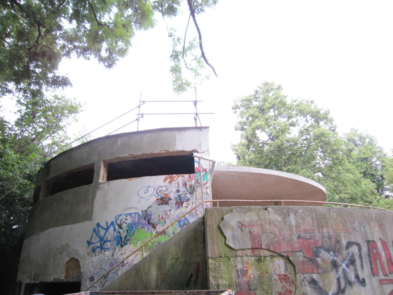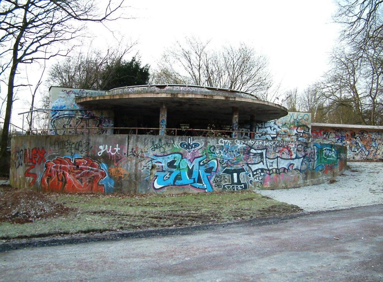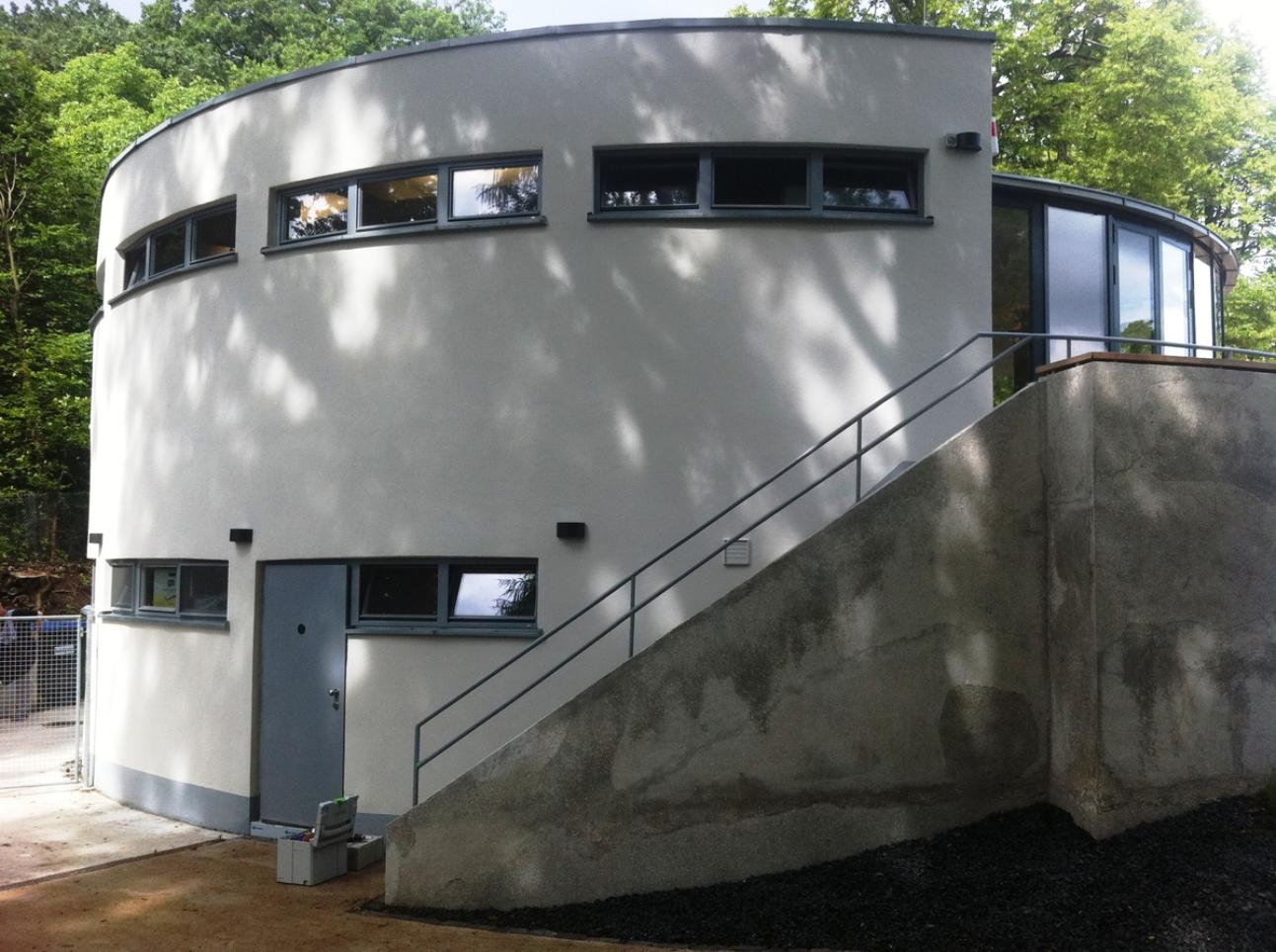 Der Huthparkpavillon hat einiges erlebt. Er sollte abgerissen werden und hat schließlich doch noch einmal Glück gehabt. Erbaut wurde er zwischen 1929 und 1930 im Rahmen des Bauprogramms „neues Frankfurt“. Konzipiert wurde das Gebäude ursprünglich als Sportstättenerweiterung mit Duschkabinen für die nahegelegene Zentgrafenschule und als Unterstand bei schlechtem Wetter. Namhafte Frankfurter Architekten – unter der Aufsicht von Stadtbaumeister Ernst May, gaben dem Pavillon seinen eigenständigen Charakter. Er liegt in leichter Hanglage, wodurch er talseitig ein Untergeschoss hat. Ein Schirmdach überwölbt den halbkreisförmigen Hauptraum im Erdgeschoss von wo aus sich ein schöner Blick in den Park ergibt. Nach einer Sanierung in den 1960er Jahren wurde das Gebäude irgendwann nicht mehr genutzt. Es verwahrloste in den Folgejahren derart, dass es 2004 zu einem Abrißantrag des Schandflecks durch den Ortsbeirat gekommen ist. Allerdings wurde hier die denkmalpflegerische Bedeutung unterschätzt. Nach weiteren Jahren der Verwahrlosung wurde 2009 endlich grünes Licht für die aufwendige Sanierung zur Umnutzung zu einem Parkcafé gegeben. Die Rotunde des Pavillons wurde nach dem Entwurf des Frankfurter Architekten D.W. Dreysse vollflächig verglast. So entstanden im Innenraum 45 Sitzplätze. Der Außenbereich hat eine große Sommerterrasse, im Untergeschoss wurden öffentlich zugängliche Toiletten bereitgestellt. Aufgrund der sehr kleinen Öffnungsformate zählte bei den Lichtbandfenstern jeder Millimeter. Hier fiel die Wahl auf sehr schlanke 58mm Profile. Um jeden Millimeter Holzanteil zu sparen und Glasfläche zu gewinnen wurde ganz bewusst auf moderne Beschlagtechnik verzichtet. Die Türen wurden als Vollblatttüren konstruiert. Die Arbeiten wurden von der Schreinerei Christian Reul aus Frankfurt umgesetzt. Heute wird der Huthparkpavillon von den Parkbesuchern gerne besucht und kann den nächsten Jahrzehnten gelassen entgegen sehen.