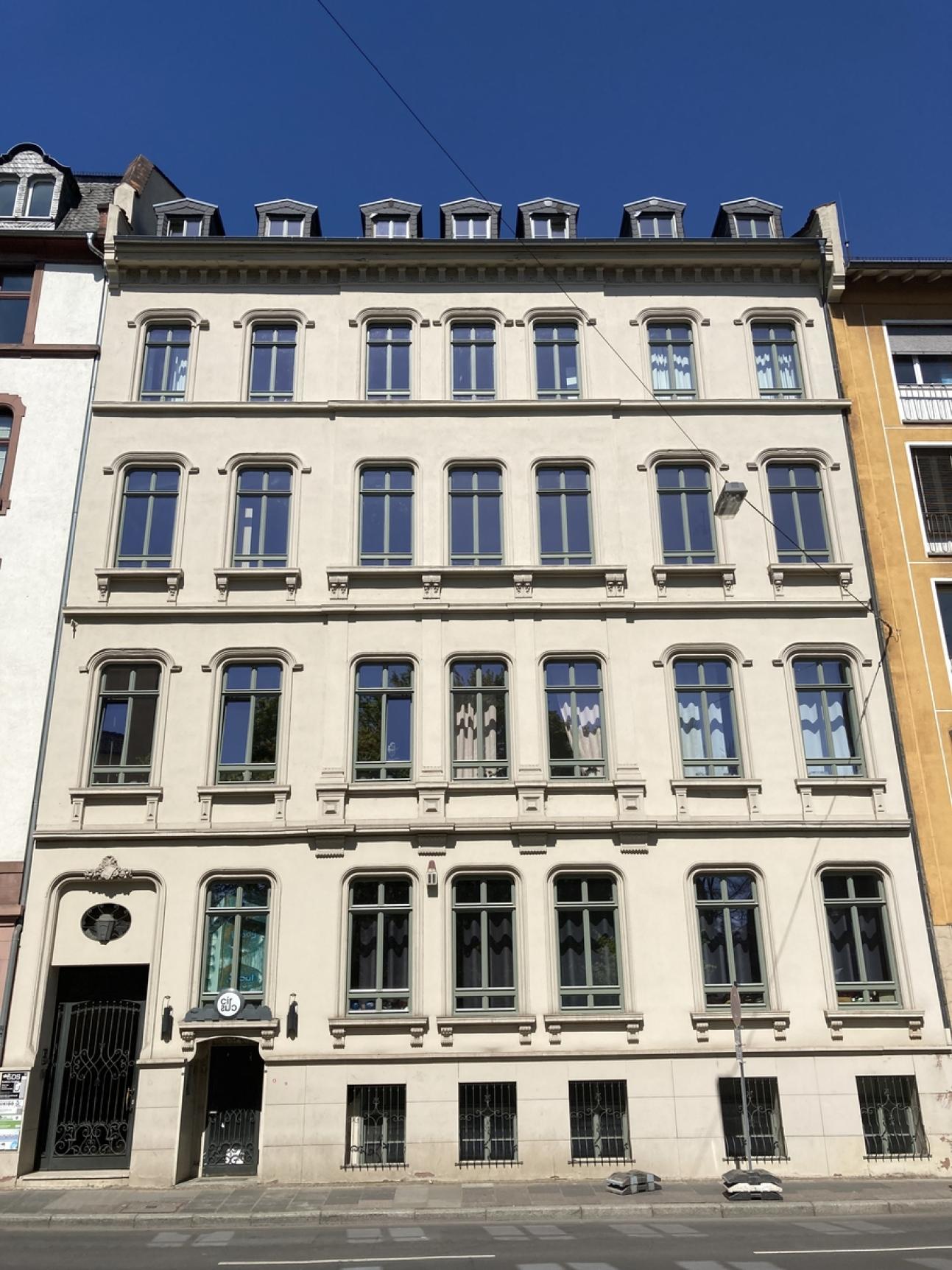 Das Haus wurde 1858 in zentraler Lage von Frankfurt am Main erbaut. In der Denkmalakte steht nur kurz und bündig: „Nobles Mietshaus, zentriert durch dreiachsigen Fassadenrisalit“. Die sehr symmetrisch gestaltete Fassade ist ebenso gekonnt wie sparsam mit für die Erbauungszeit typischen Stuckelementen verziert. Auf den ersten Blick wirkt sie fast langweilig. Tatsächlich aber, wenn man sich die Details in Ruhe ansieht, fallen vor allem die vielen Konsolen mit den Diamantquadern oder dem Rankwerk auf. Besonderen Wert legte der Architekt auf die ausdruckstark mit Gesims- und Stuckprofilen eingerahmten Fenster. Über alle vier Etagen hat er das gestalterische Thema der abgerundeten Ecken eingehalten, auch damals zur Erbauungszeit kein preiswertes Vergnügen! Den nicht mehr bauzeitlichen Nachkriegsfenstern aus den 1980er Jahren fehlten in der Binnengliederung die Teilung von Ober- und Unterlicht sowie die Zierprofile auf Kämpfer und Schlagleiste. Da Schall- und Wärmedämmung der Bestandsfenster sehr verbesserungsbedürftig waren, wurden neue PaXretro68-Fenster angefertigt. Im Zuge der Rekonstruktion waren alte Fotos vom Gebäude sehr hilfreich. Sehr weit musste das Denkmalamt nicht zurückgehen: Ein Foto aus den 1970er Jahren zeigt sehr gut, wie die bauzeitlichen Fenster ausgesehen haben. Zusammen mit einer anderen Farbgestaltung der Fenster (grün statt grau) wirkt die Fassade jetzt unbestritten wieder so nobel wie zur Erbauungszeit. Die stimmigen Fensterarbeiten wurden von der Schreinerei Blum aus Frankfurt in Absprache mit dem Denkmalamt durchgeführt.