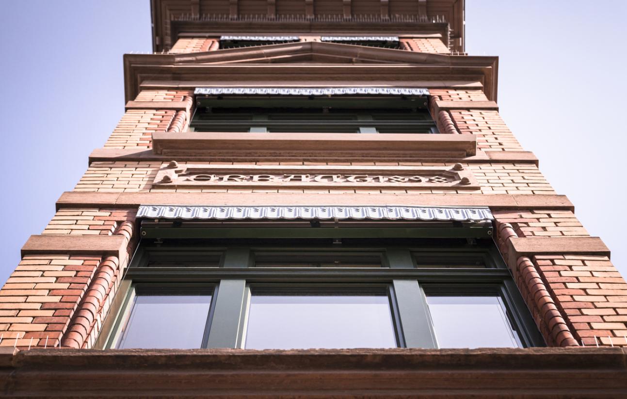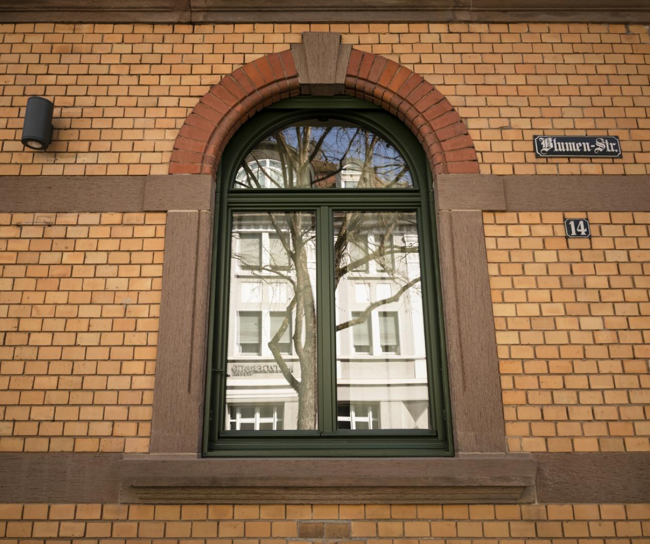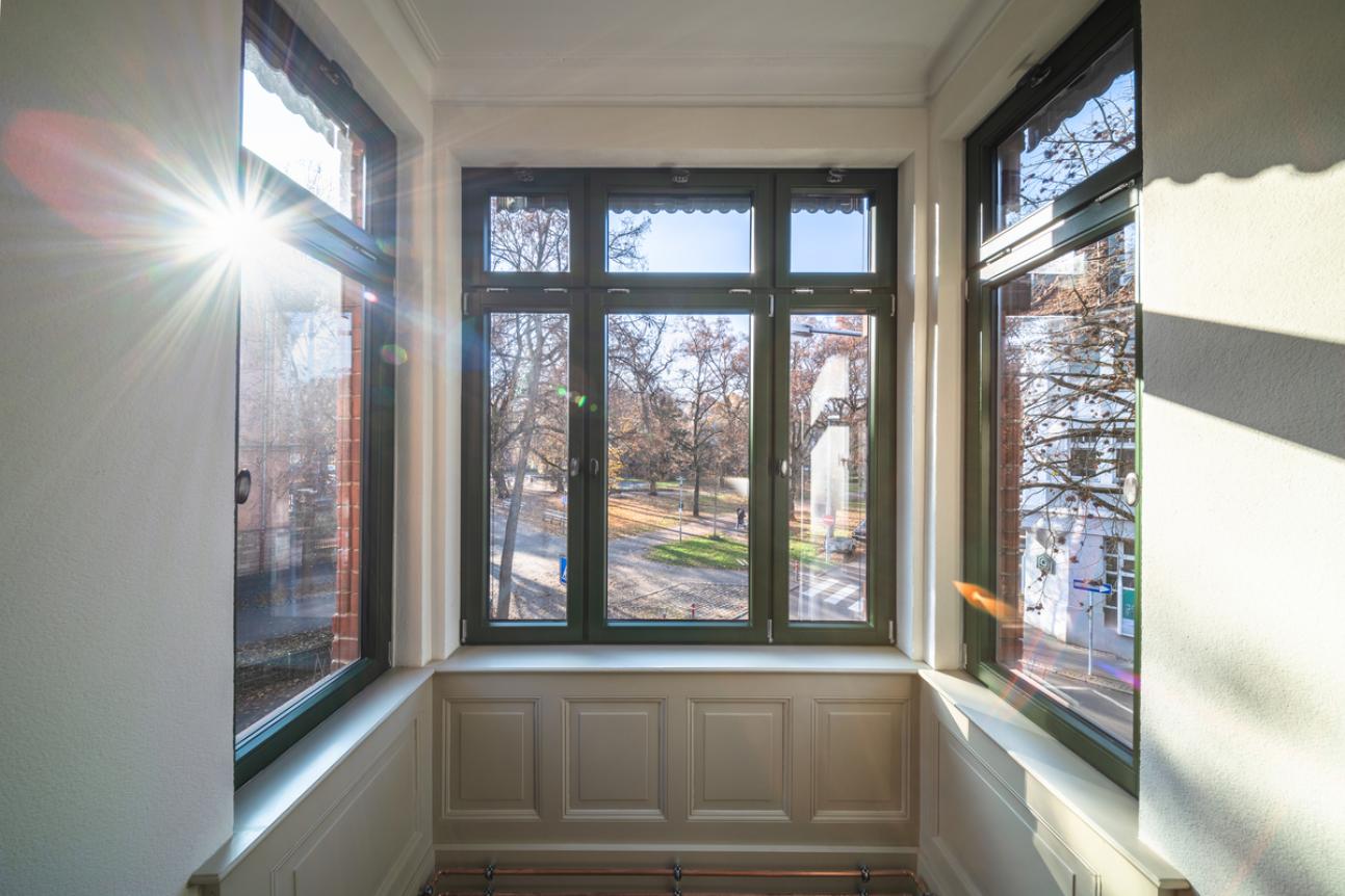 Die in den 1960ern fast ausschließlich eingebauten einflügeligen Verbundfenster bildeten jedoch dunkle Löcher in der Fassade. Glücklicherweise existierten noch drei bauzeitliche Fenster, welche nicht nur restauriert sondern auch als historische Vorlage zur Rekonstruktion herangezogen werden konnten: zwei befinden sich im Treppenhaus und eines in einer Erdgeschosswohnung. Insbesondere letzteres diente als Muster zur Nachbildung. Für die Zierprofile an Kämpfer und Sohlbank wurden mit einem speziellem Werkzeug, dem sogenannten Profilkamm, die Profile abgetastet und für die Nachfertigung spezielle Fräsmesser hergestellt. Die detailgetreue Nachbildung zusammen mit der Aufnahme der bauzeitlichen Fensterteilung gab so der Fassade wieder ihr ursprüngliches Gesicht.
