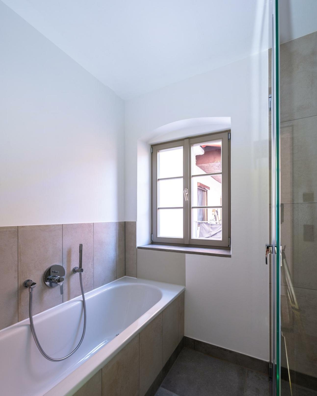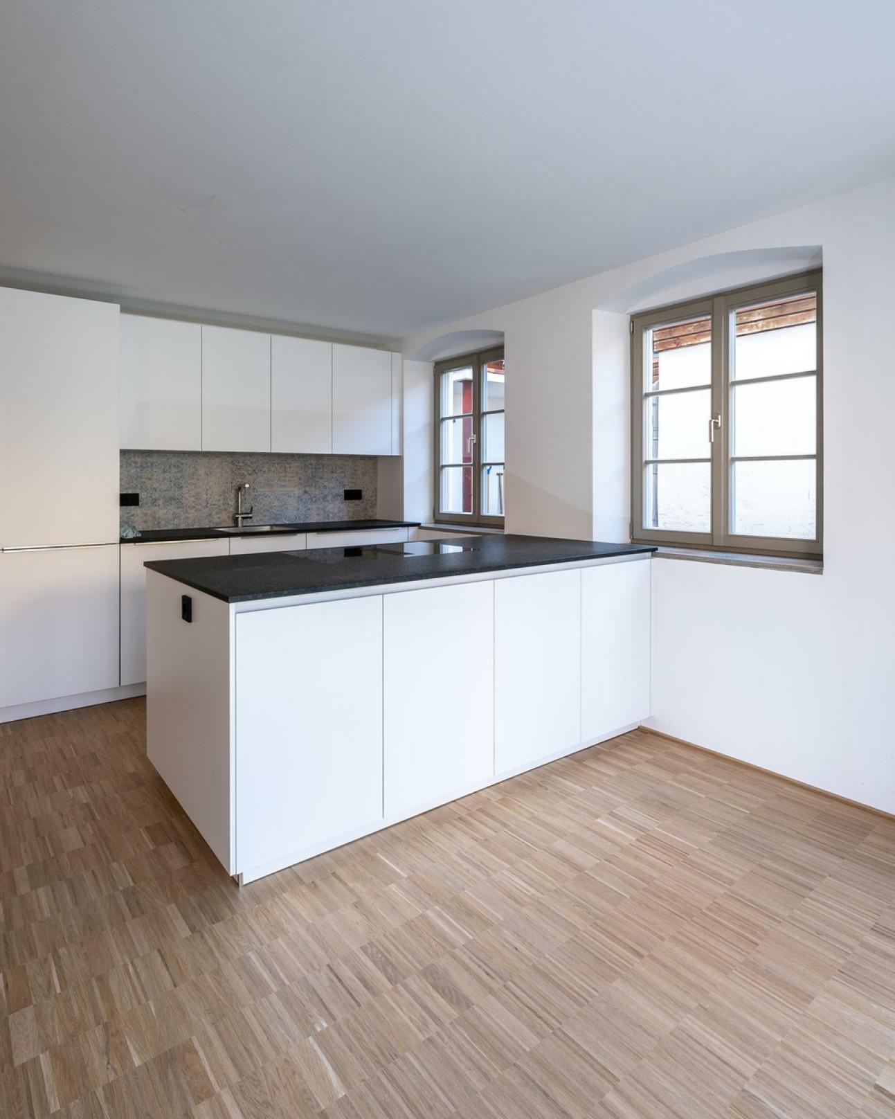 Ziel der kürzlich abgeschlossenen Sanierung war die Schaffung von hochwertigem Wohnraum und die Nutzung des hinteren Grundstückareals. Dazu wurde die historische Hofzufahrt wieder geöffnet und die Kleinteiligkeit der alten Wohnräume im Haupthaus komplett entfernt.