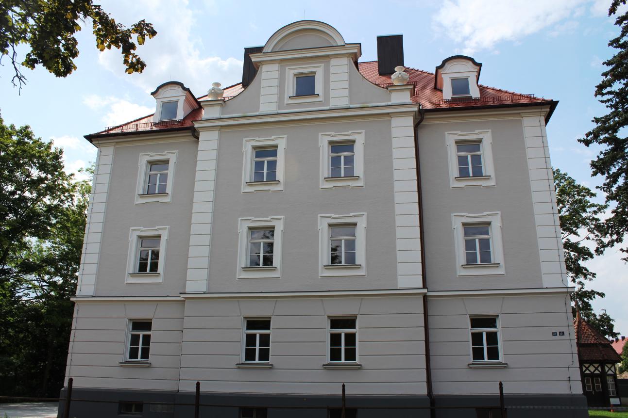 Rekonstruktion abgängiger bauzeitlicher Fenster mit PaXretro68 für ein ehemaliges Dienstwohnhaus. Das unter Denkmalschutz stehende Gebäude wurde 1904 im Stil des Neoklassizismus erbaut und wird geprägt durch den betonen Mittelrisalt mit Eckquaderungen und bekrönendem Schweifgiebel sowie dem Walmdach mit leicht barockisierenden Gauben. Die neuen PaXretro68 Fenster mit dem objektbezogen angefertigten Kämpferzierprofil passen hervorragend in die mit umrandenden Stuckornamenten fassadenprägenden Fensteröffnungen.