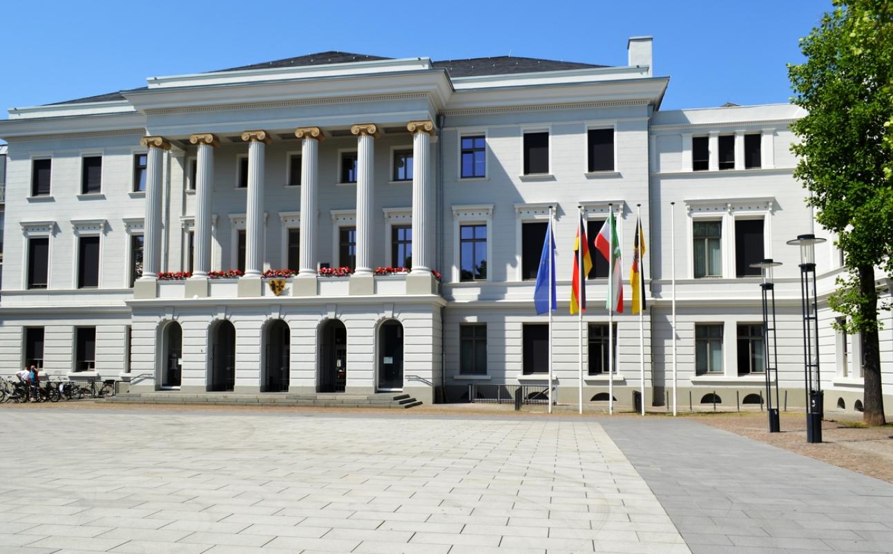 Das Hauptgebäude des denkmalgeschützten Rathauses in Krefeld wurde zwischen 1791 und 1794 als Stadtpalais des Fabrikanten Conrad von der Leyen erbaut. Schon ab 1860 diente es der Stadt als Rathaus, was aber nach kurzer Zeit bereits zu klein wurde. So entstanden 1891-1892 der Nordflügel im Renaissancestil sowie 1934 bis 1936 weitere Anbauten. Im zweiten Weltkrieg wurden die Gebäude weitgehend zerstört, einzig die Umfassungsmauern und die Säulen blieben bestehen. Nach dem Krieg wurden die Gebäude, weiterhin zur Nutzung als Rathaus, wieder aufgebaut.