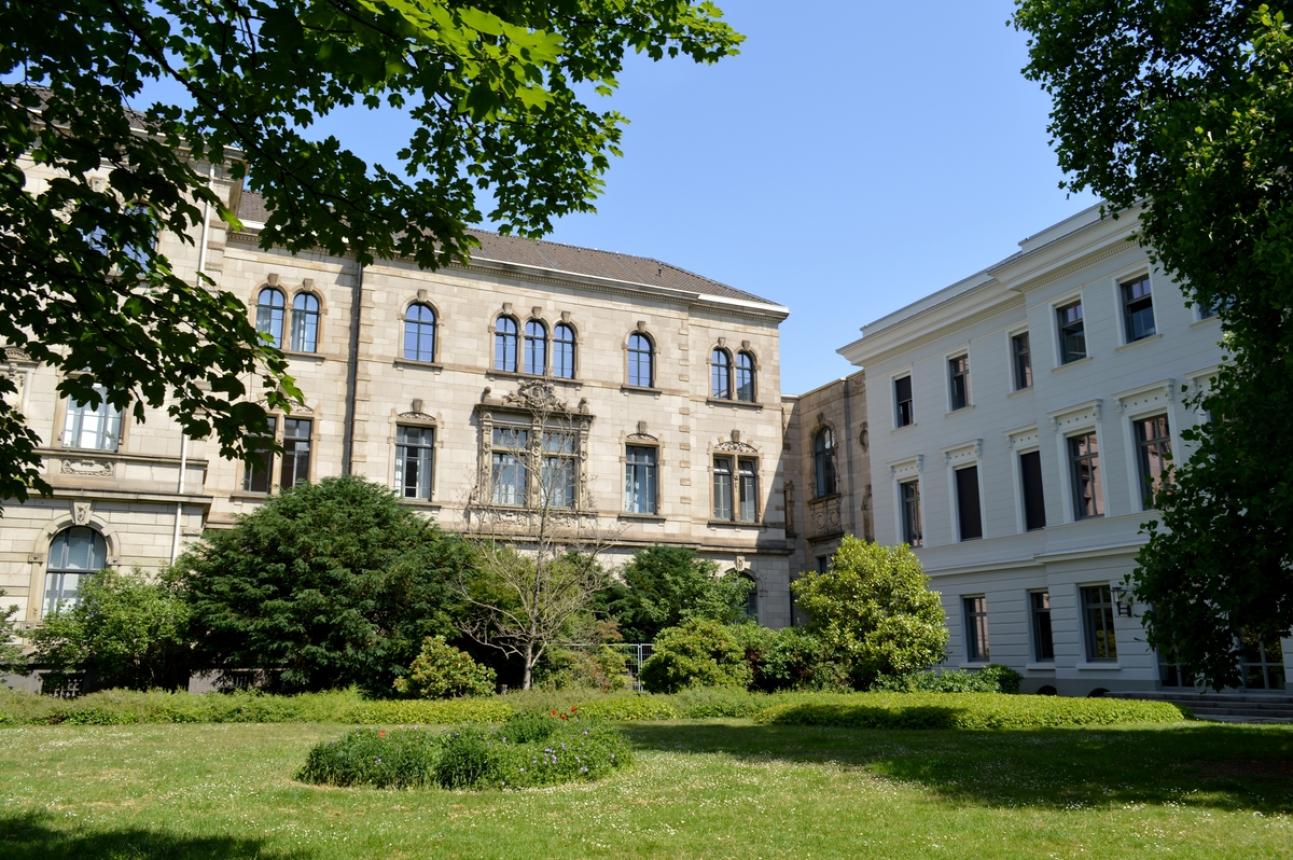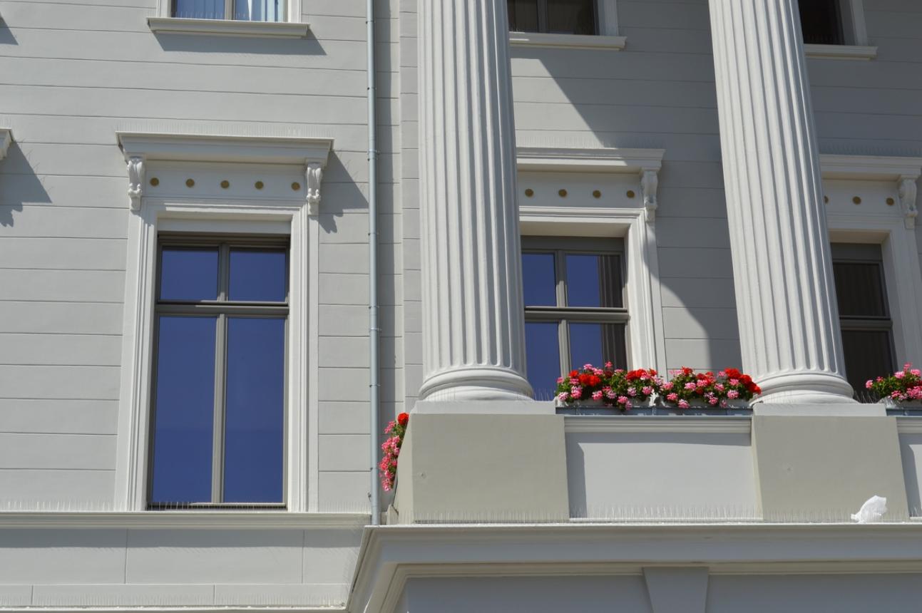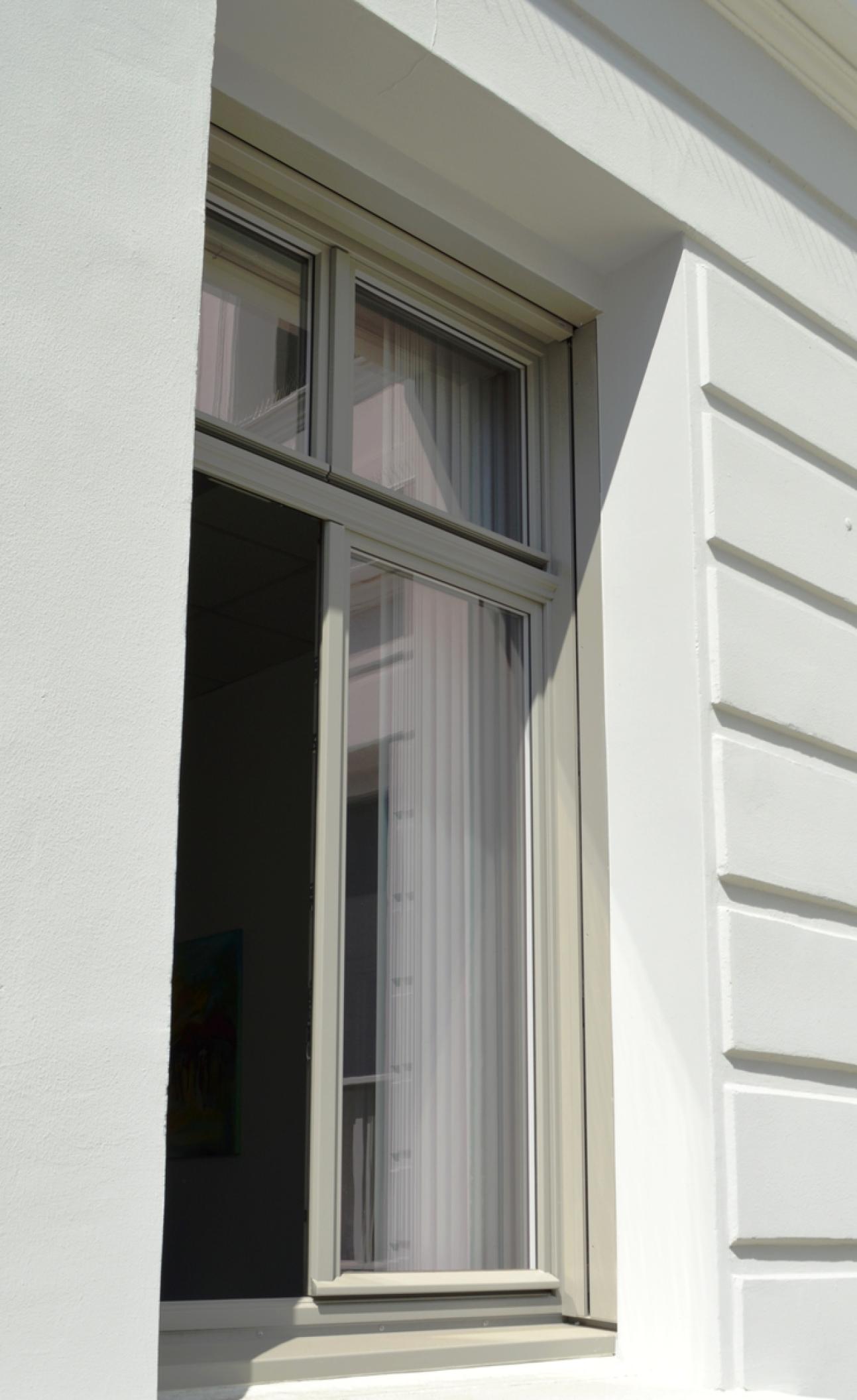 Stilistisch sollten sie klassischen schmalen Fensterquerschnitten ähnlich sein - trotz teilweise sehr großer Formate mit Fensterhöhen von bis zu 4 Metern. Da bei den großformatigen Fenstern und der Ausrichtung des Gebäudes Sonnenschutz ein wichtiges und nachvollziehbares Thema ist, musste auch hier eine denkmalgerechte Lösung gefunden werden, die die sanierte Fassade nicht entstellt. Die Wahl fiel auf eine Konstruktion, bei der die Sonnenschutzrollos in einem sehr unauffälligen, schmalen kleinen Vorsatzkasten untergebracht wurden und die seitlichen Führungen in einer besonderen Blendrahmenaufdopplung laufen. Im geschlossenen Zustand ist diese Lösung erfreulich unauffällig. Ebenfalls ausgezeichnet gelöst ist die Qualität der Verglasung. Da die Fenster mit den großen Scheibenformaten maßgeblich die Fassadenwirkung beeinflussen, entschied man sich für eine Sonderverglasung von SCHOTT, die mit einer authentischen, leicht unregelmäßigen Oberfläche den gewünschten Eindruck einer historischen Verglasung sehr gut abbildet. Zusätzlich bietet die besondere Glasqualität den Vorteil, dass sie unbeschichtet und vollkommen farbneutral ist. Dennoch ist es gelungen, neben dem denkmalgerechten Erscheinungsbild zeitgemäßen und bauphysikalisch optimalen Wärmeschutz sowie hohen Schallschutz zu erreichen.