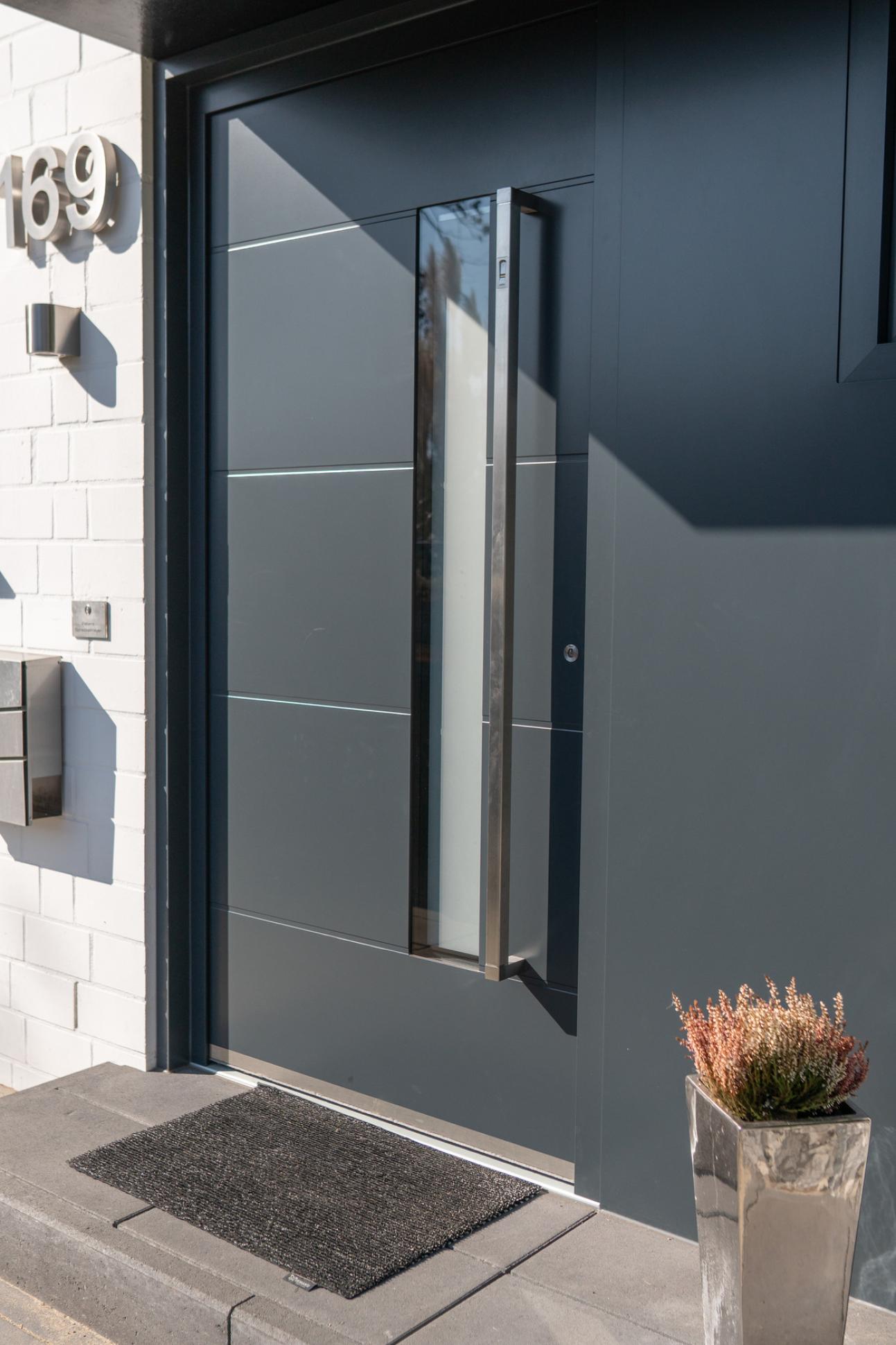 Für die Sanierung eines modernen Einfamilienreihenhauses in Münster entschieden sich die Bauherren für hochwertige Kunststoff-Aluminium-Fenster von PaX in Kombination mit einer eleganten PaXentrée Aluminium-Haustür. Innen präsentieren sich die Fenster in einer edlen, dunkelgrauen Folierung, während die Außenseite durch eine langlebige Aluminiumschale im passenden Dunkelgrauton überzeugt. Die Aluminium-Haustür wurde ebenfalls in einem harmonisch darauf abgestimmten Farbton gefertigt und fügt sich perfekt in das Gesamtbild der Fassade ein.
