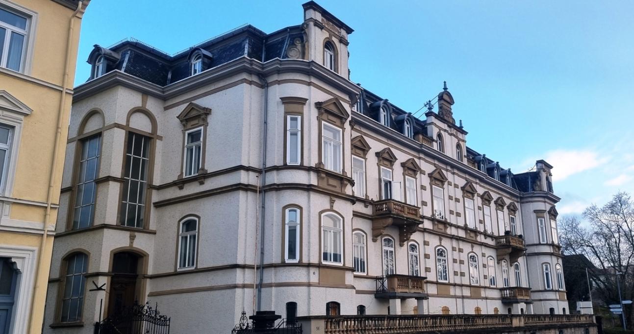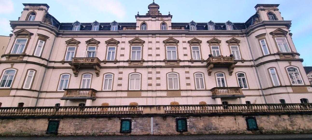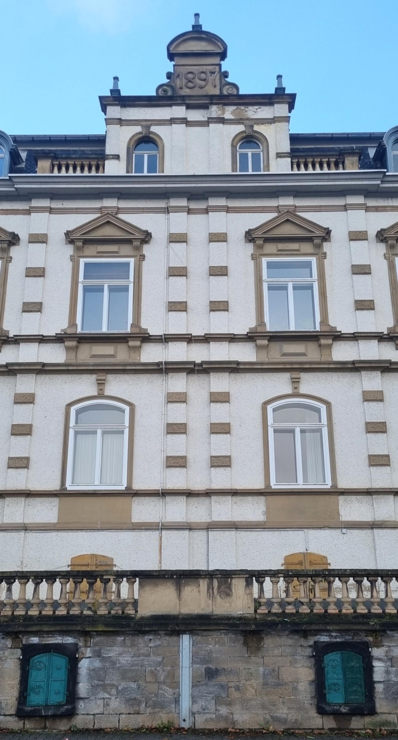 Das strassenbildprägende und beeindruckende Gebäude wurde 1897 erbaut und steht unter Denkmalschutz. Und es steht in unmittelbarer Nähe zur stark frequentierten Bundesbahnstrecke. Somit wurde auch dieses Denkmal in das "Lärmsanierungsprogramm an Schienenwegen des Bundes" aufgenommen und es wurden neue Fenster der Schallschutzklasse 4 bezuschußt. Allerdings kam eine Erneuerung der überwiegend noch bauzeitlichen, einfachverglasten Fenster für das Landesamt für Denkmalpflege nicht in Frage. Eine andere, denkmalverträgliche Lösung als der totale Substanzverlust historischer Bauteile musste gefunden werden. Der Vorschlag von PaX, die historischen Fenster komplett zu restaurieren und mit einer umlaufenden Dichtung zu versehen und diese Fenster - so wie es schon historisch teilweise umgesetzt wurde, durch auswärts öffnende, einfachverglaste Vorsatzfenster zu ergänzen, wurde dankend aufgenommen. Für diese Konstruktion konnte ein Gutachten die Schallschutzklasse 4 belegen und somit war die Kombination aus Erhalt und denkmalgerechter Ergänzung voll förderfähig. Die nicht bauzeitlichen Gaubenfenster wurden bei der Sanierungsmaßnahme gegen neue Isolierglasfenster mit 58mm Bauteiltiefe, der Schallschutzklasse 4 und sehr schmalen Ansichtsbreiten ersetzt. Jetzt präsentiert sich das Fassadenbild wieder sehr schlüssig und für heutige Vorstellungen vor allem erfrischend unkonventionell - wann haben Sie das letzte Mal ein solches Vorkommen auswärts öffnender, fassadenbündiger Vorsatzfenster gesehen?