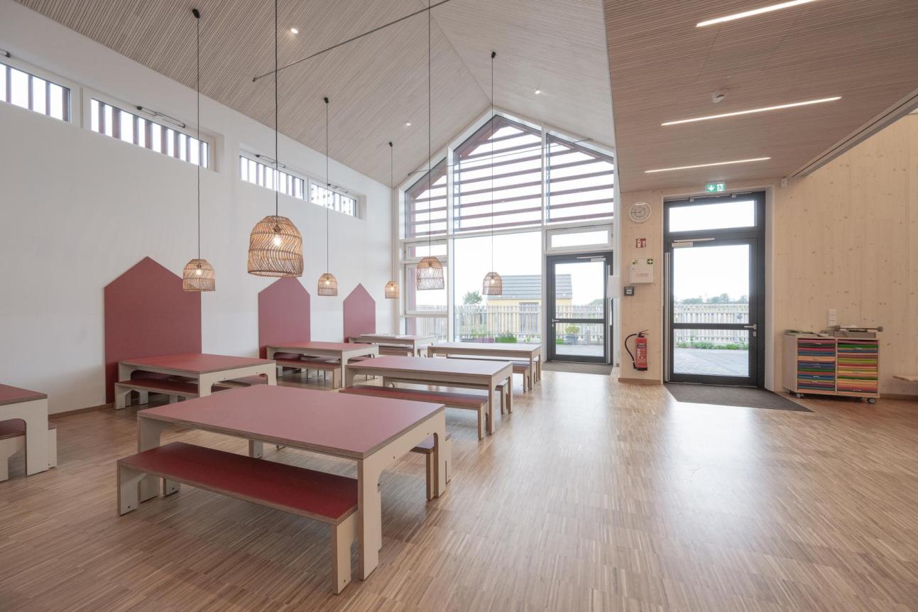 Die Kindertagesstätte Sträßchen in Burscheid, nahe Leverkusen, wurde im Mai 2024 eröffnet und bietet mit ihrem einzigartigen Konzept einen besonderen Ort für 94 Kinder aus der Umgebung. Jedes der farbenfrohen Giebelhäuser ist einer festen Gruppe zugeordnet, sodass jedes Kind sofort weiß, in welchem „Zuhause“ es sich befindet. Zwei zusätzliche Giebelhäuser dienen als Mehrzweckräume für Veranstaltungen und Mahlzeiten.