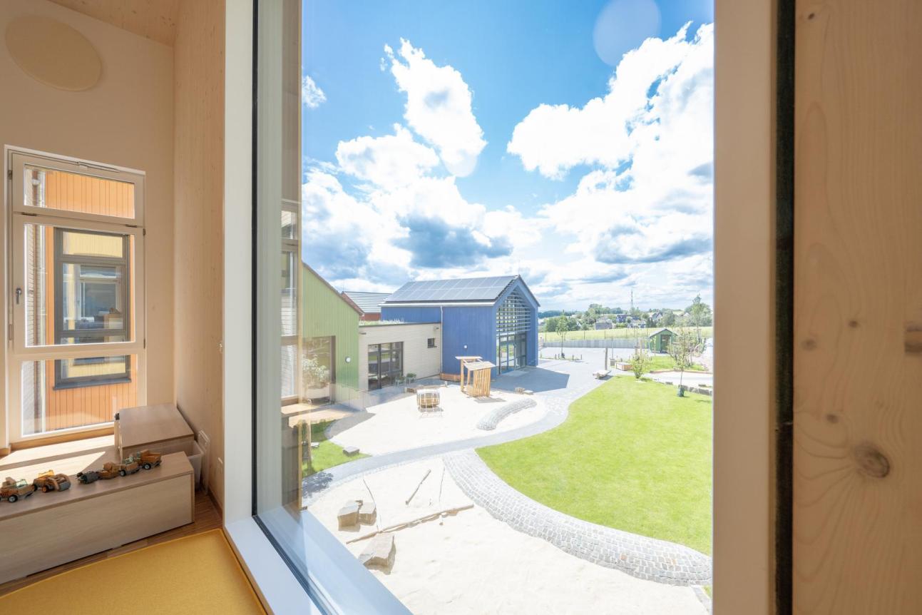 Für die Ausführung der Holz-Aluminium-Pfosten-Riegel-Konstruktionen und der auswärts öffnenden Eingangstüren aus Aluminium wurde der PaX-Partner Fachbetrieb Schreinerei Runkel aus Hückeswagen beauftragt. Die bodentiefen Fenster bieten den Kindern nicht nur eine sichere Umgebung, sondern auch einen einzigartigen Ausblick auf das gesamte Kita-Gelände. Die Eingangstüren sind harmonisch auf die Fassadenfarbe der jeweiligen Giebelhäuser abgestimmt. Die Wahl der Fichte als Holzart unterstreicht das nachhaltige Gesamtkonzept, da sie die besten Wärmedämmwerte aller bei PaX verfügbaren Hölzer bietet.