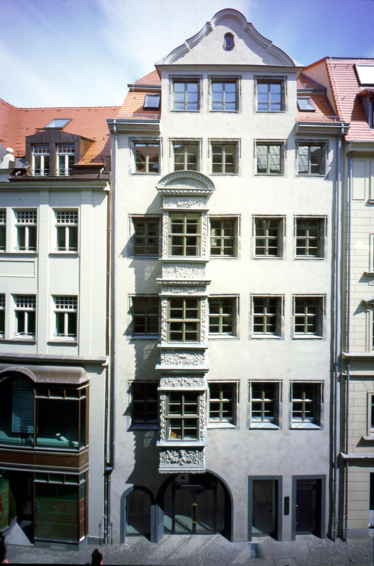 Das Haus in der Hainstraße 8, in dem Radischtschew lebte, hat eine nachweisbare Geschichte, die in der Mitte des 16.Jhds beginnt.. In der "Anderschen Hauschronik" erscheint der aus Nürnberg kommende Anton Lotter 1542 als Käufer. 850 Taler mußte er für den Renaissancebau bezahlen. Es ist davon auszugehen, dass das Haus schon kurz darauf umgebaut wurde, was den um das vierfache gestiegenen Preis beim erneuten Verkauf nach nur wenigen Jahren erklären würde. im Jahre 1703 wurde das Haus abermals umgebaut - der damalige Besitzer erweiterte die Fassade durch einen reich verzierten Kastenerker, der über zwei Etagen reichte. nach weiteren acht Jahren wurde der Erker um eine Etage aufgestockt und prägt in dieser prächtigen Ausführung, die dem Bildhauer Johann Jacob Löbelt zugeschrieben wird, das Erscheinungsbild unverändert bis zum heutigen Tage. Seit der Mitte des 19.Jhds. geriet auch die Hainstraße 8 durch jahrzehntelange Vernachlässigung in einen kritischen Zustand. Nachdem das Haus jahrelang unbewohnt war und das Nachbargebäude bei seinem Einsturz 1994 die Dächer vom Hinterhaus und vom südlichen Seitentrakt sowie die oberen Etagen zerstörte, konnte die Geschichte der Hainstraße 8 in letzter Minute positiv weiter geschrieben werden. Ein neuer Hüter hat um 1999 in viel Umsicht und in enger Zusammen-arbeit mit der zuständigen Denkmalpflege bewahrt, was schon verloren schien. Mit einem für ein Bürgerhaus in Leipzig noch nicht erreichten Aufwand konnte das Haus gerettet werden. Die PaXClassic Verbundfenster sind teil des stimmigen Bildes. Durch das historisierende Fourcaultglas passen sich die "neuen" Fenster mit ihren lebendigen Glasflächen ideal in die Fassade ein, auch die Verwendung historisierender Beschlagtechnik in Form von Vorreibern und Knöpfen verhindert ein für die Renaissancezeit untypische Erscheinung mit "gekippten" Flügeln.